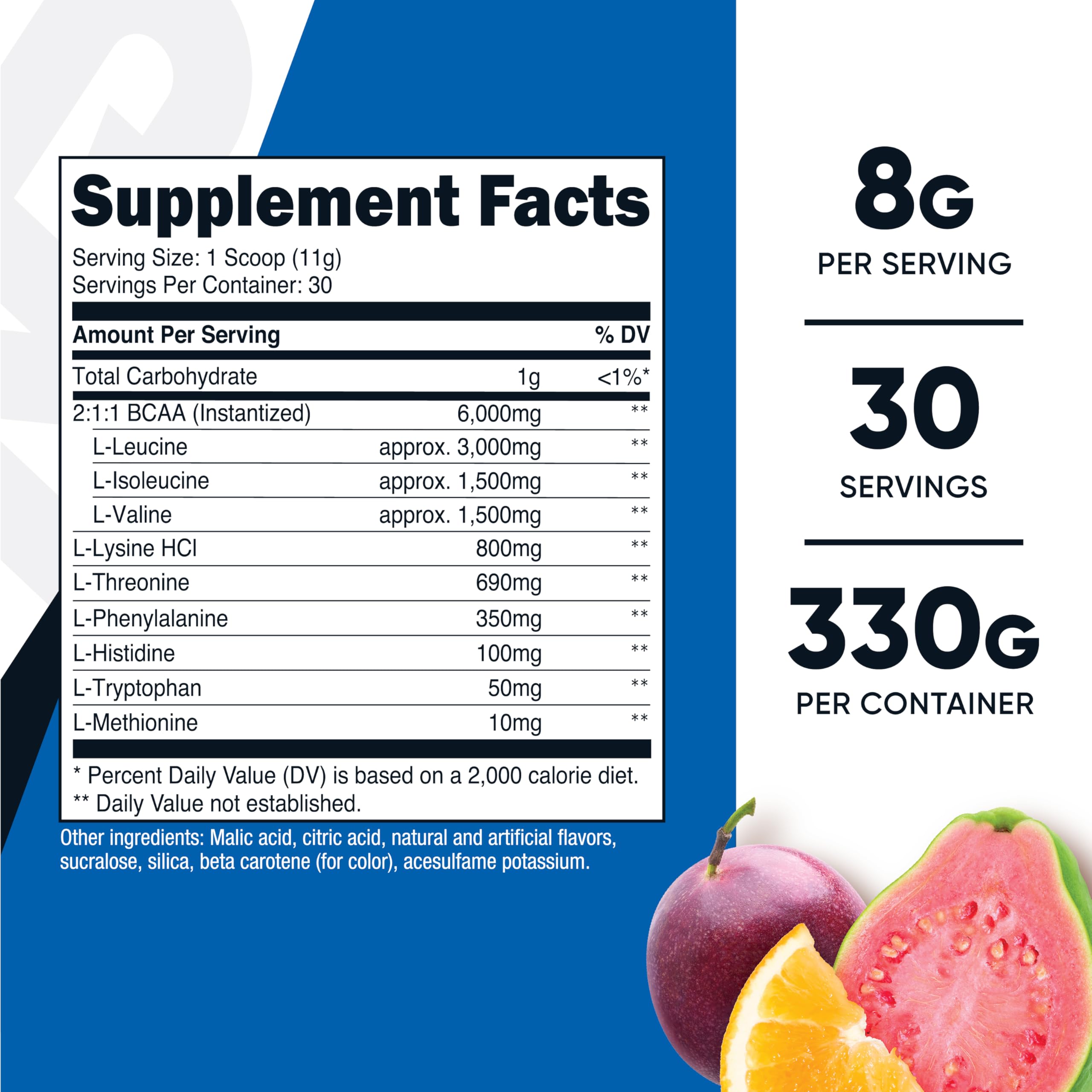 Includes 2:1:1 Instantized BCAAs (L-Leucine, L-Isoleucine, L-Valine) as well as L-Lysine HCl, L-Threonine, L-Phenylalanine, L-Histidine, L-Tryptophan and L-Methionine.
