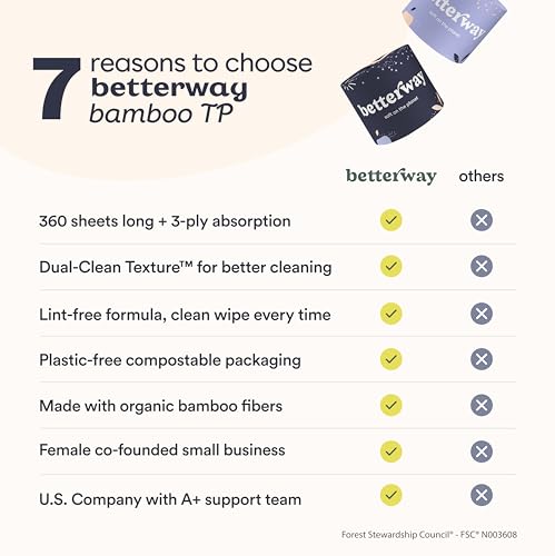 The Softest Bamboo TP w/ 100 Day Risk-Free Guarantee: How soft is it? As soft as bamboo TP gets! In a blind test of top selling sustainable TP brands, 96% of people chose Betterway as their #1 favorite! We are so confident you'll love it that you get 100 days to return it hassle free if you're not completely satisfied.