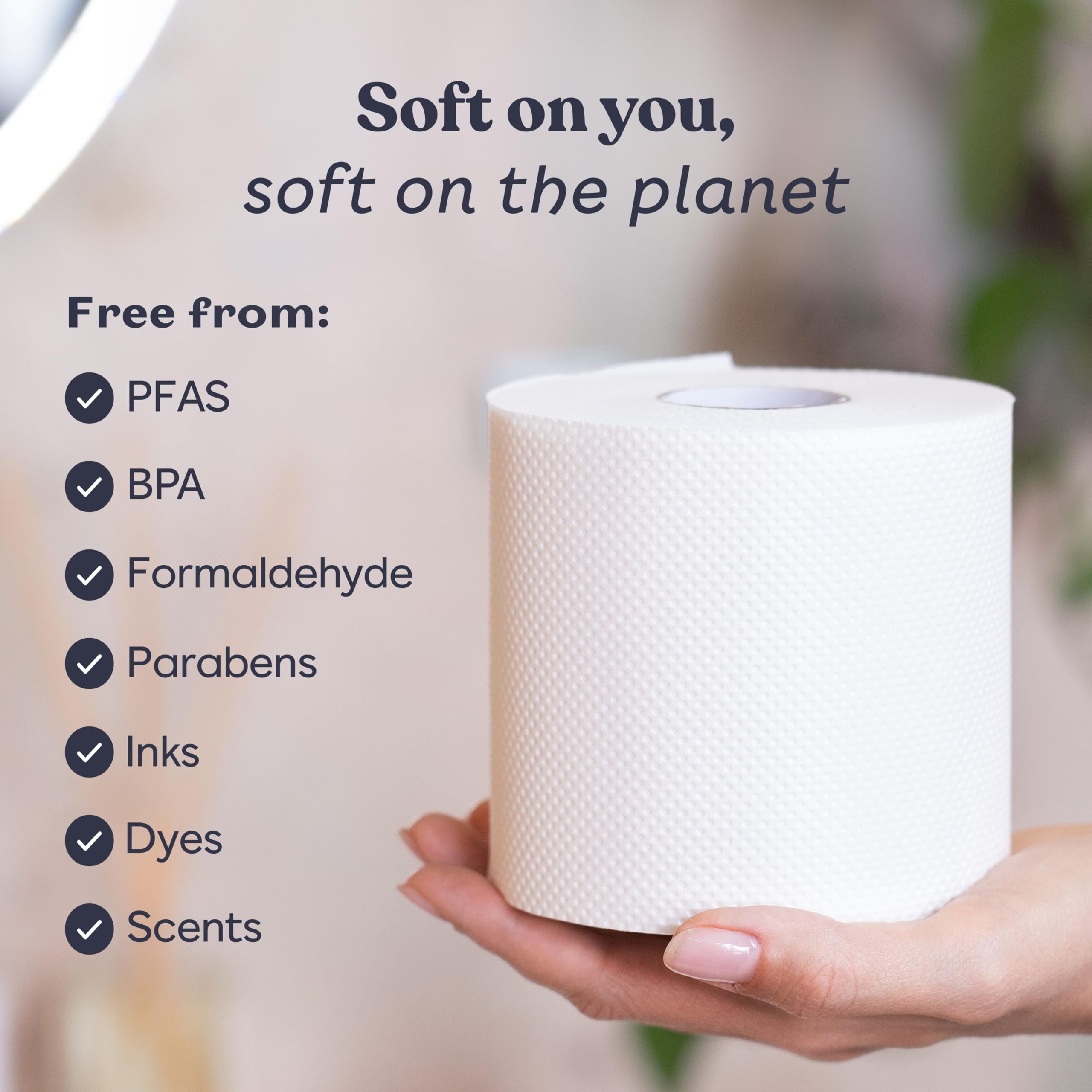 Gentle On Sensitive Skin: This bamboo paper is Unscented, Dye-Free, and PFAS Free. No more worries about irritation or sensitivity from the chemicals in regular TP brands. Our sustainable toilet paper is made with 100% all natural, non-GMO bamboo.