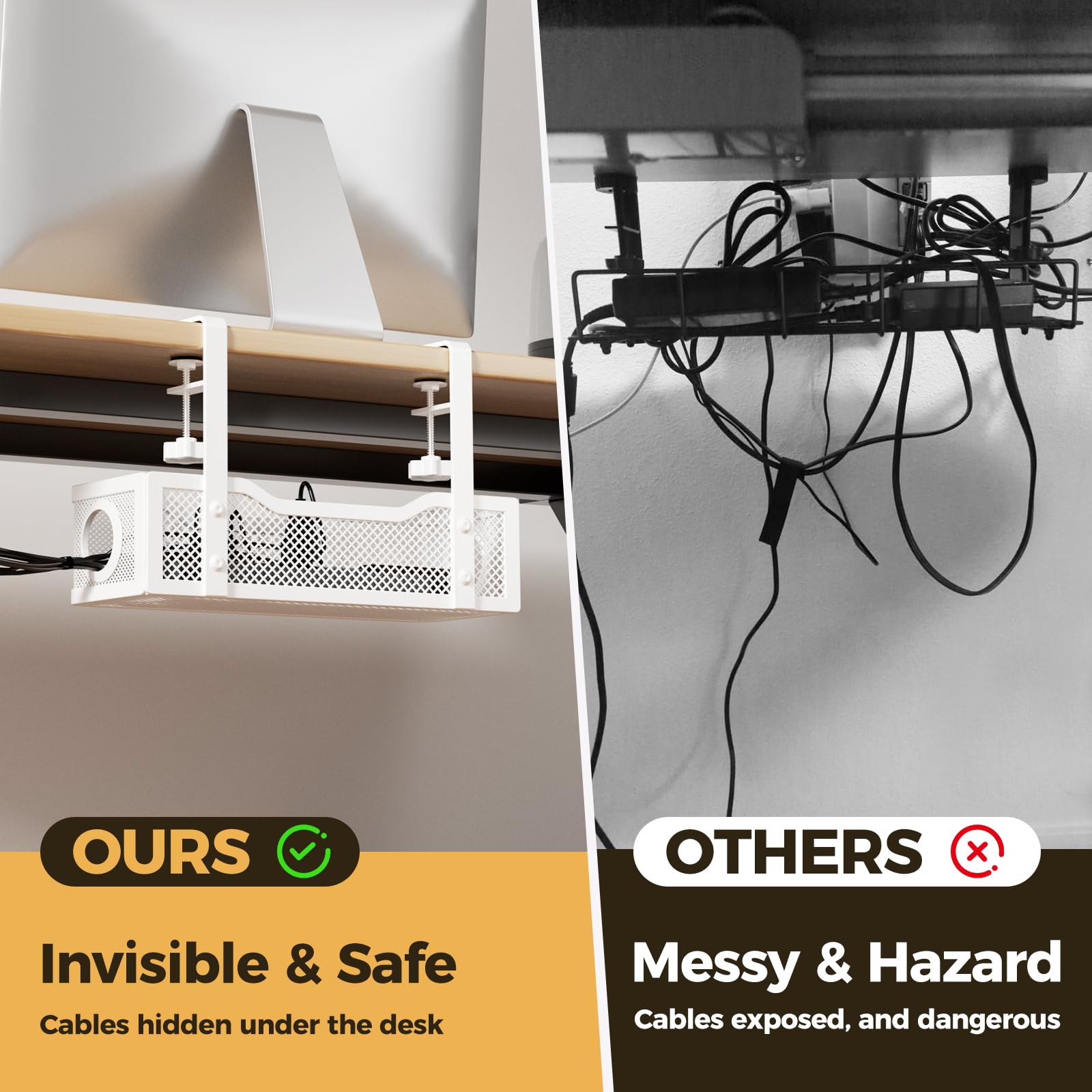 No Need to Drilling Holes - Instead of damaging to your desk, our under desk cable management tray can be hanged directly to desk frames and change its position easily as you like, unlike others screw installation. It Excellent to install a clamp on any wood, glass, or any material on your desk.