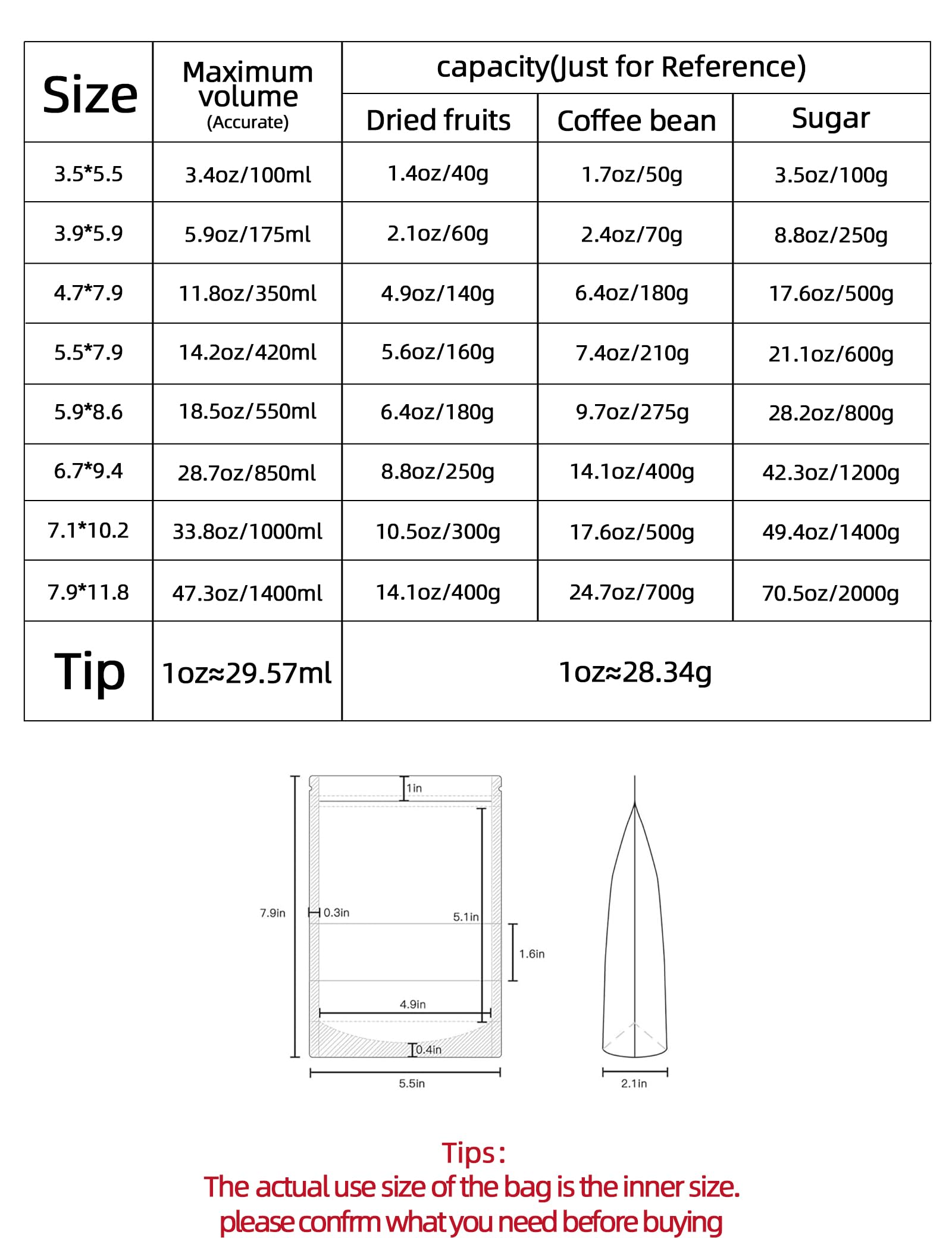 【Quantity & Material】Package include 100 pieces kraft stand up pouches. Outer dimension:5.5*7.9 inch,Inner dimension:4.9*5.1inch; Made from food grade kraft paper and plastic, which is odorless, reusable and moisture proof, keeps your products freshness.Practical bags for packing product.