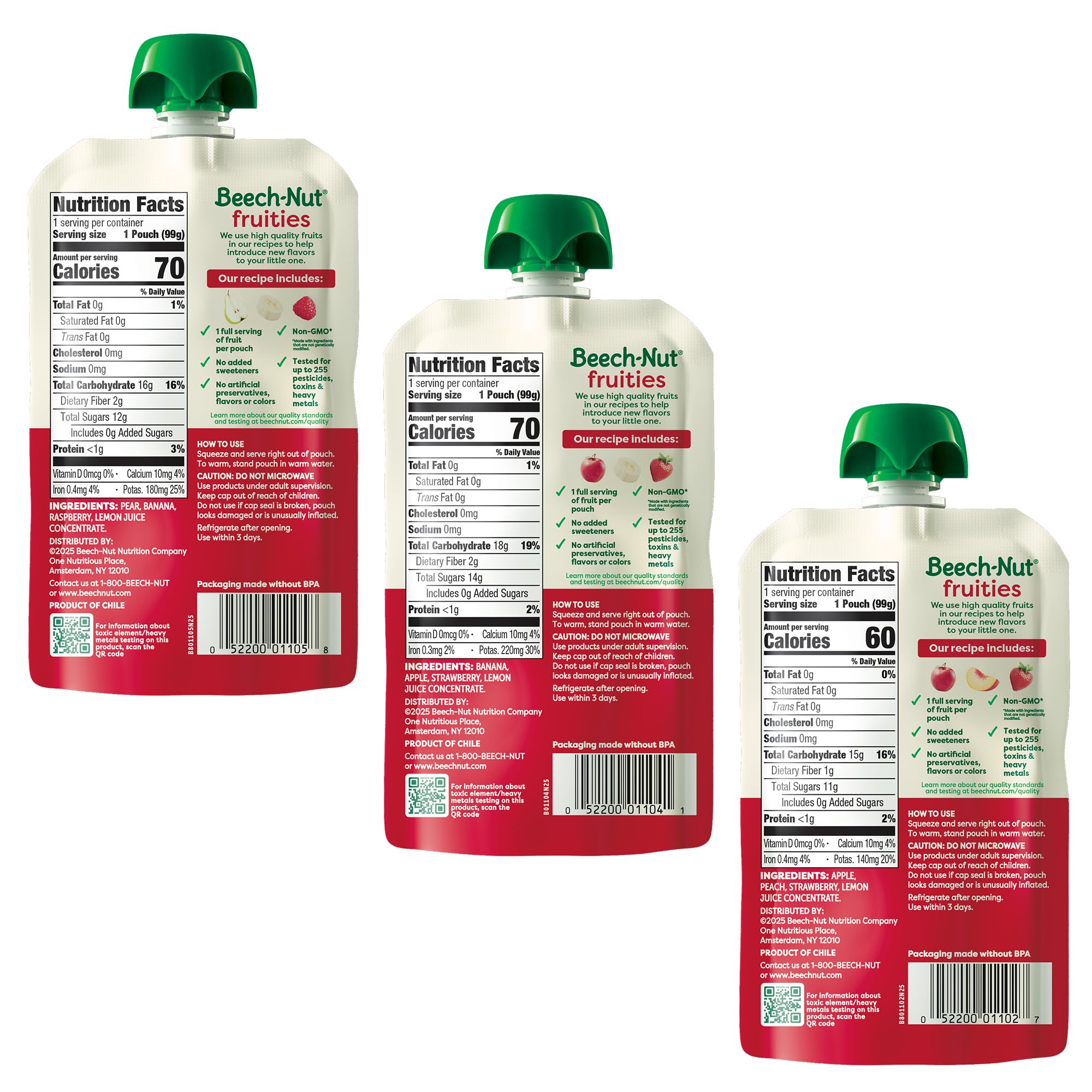 DELICIOUS FRUIT BLENDS VARIETY PACK: This variety pack contains (6) Peach, Apple, Strawberry, (6) Banana, Apple, Strawberry, and (6) Pear, Banana, Raspberry baby food pouches. Each pouch contains one full serving of fruits, making it easy to squeeze more nutrition into your little one's day.