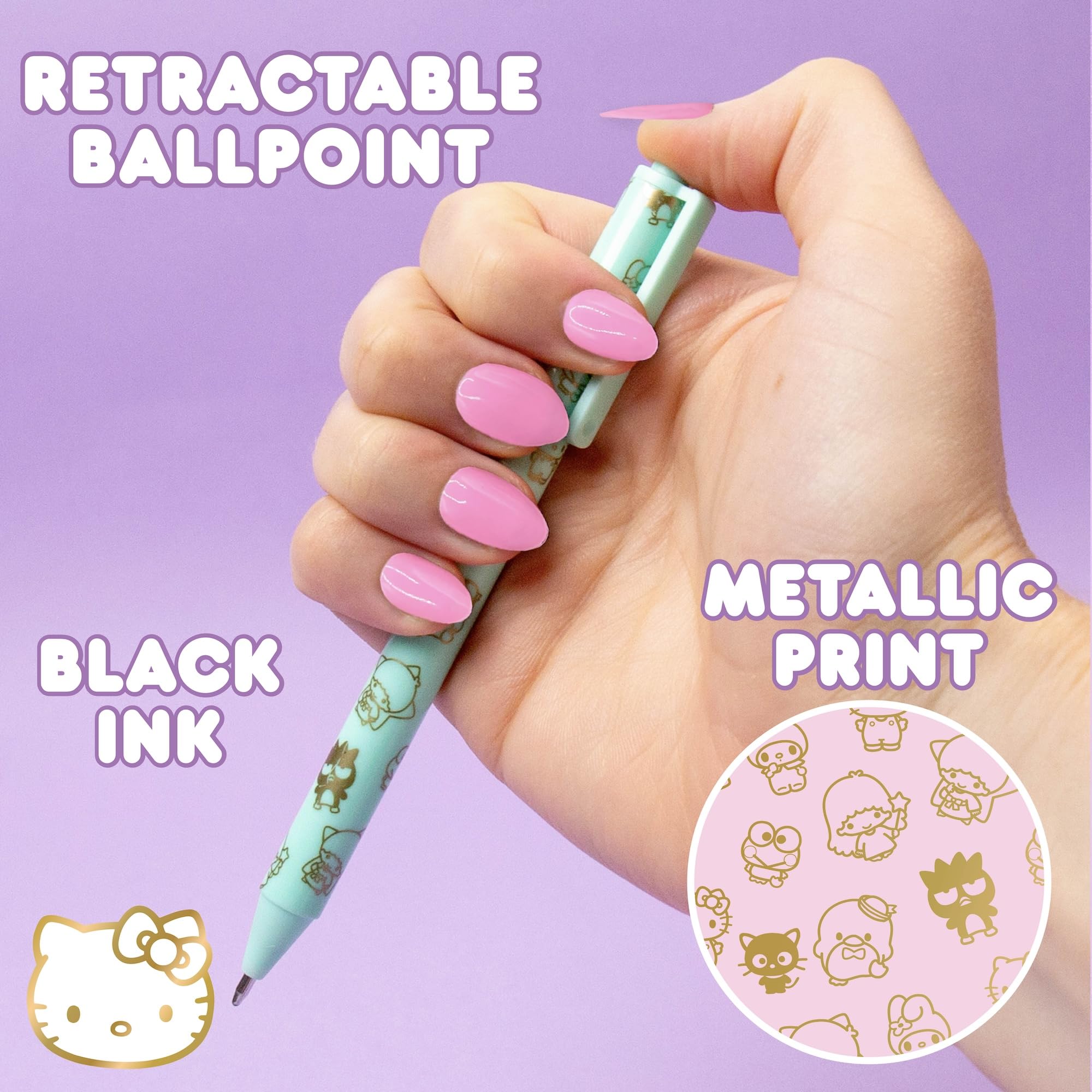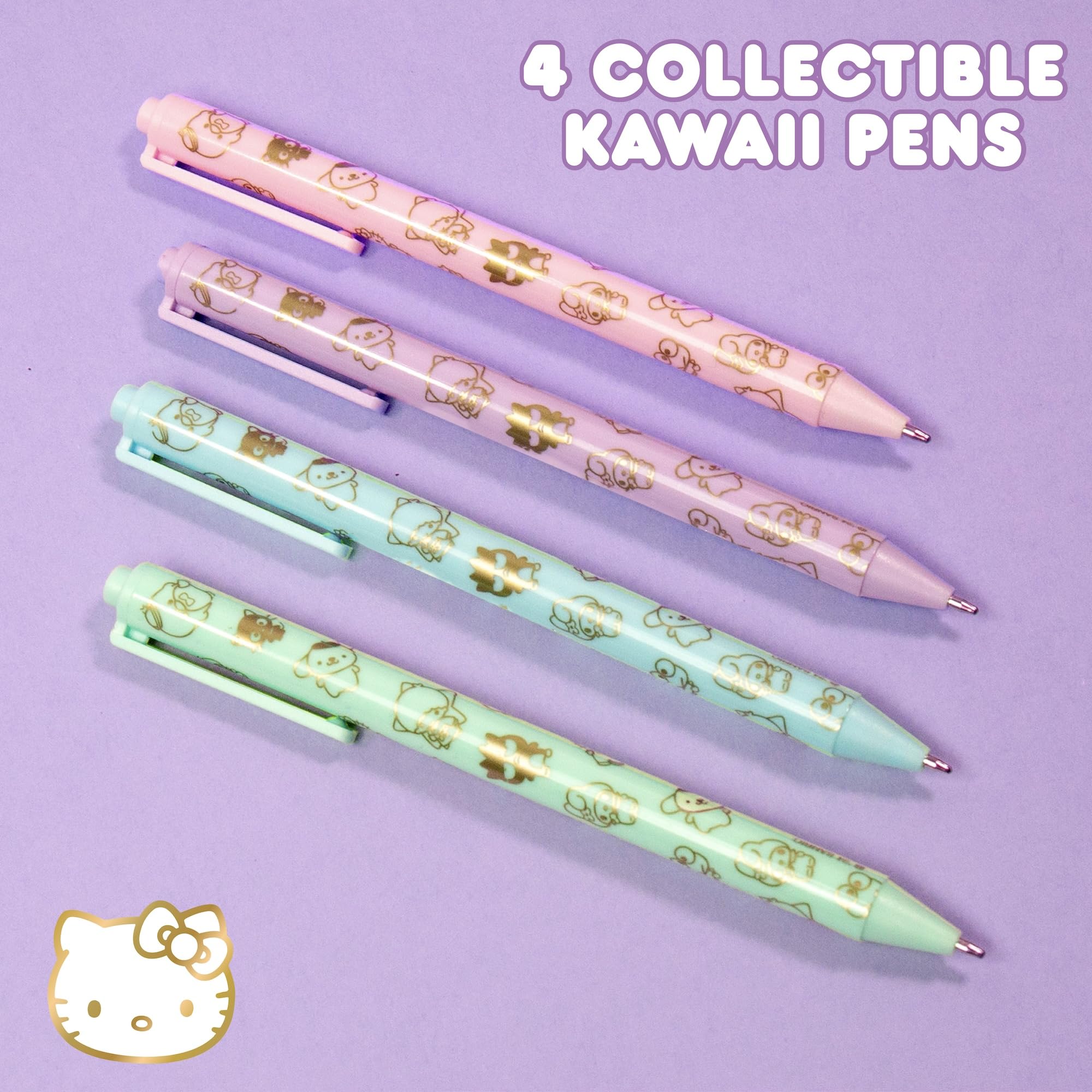4 HELLO KITTY BALLPOINT PENS: Each pen features your favorite Hello Kitty characters in shimmering gold foil, making them a kawaii addition to your work or school supplies.