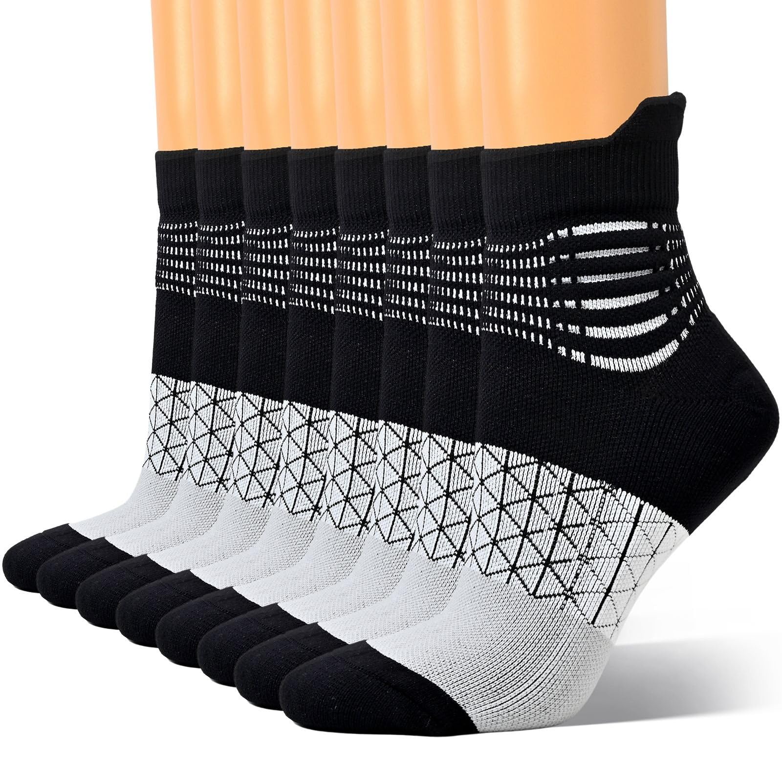 Coolmax material with nylon mesh ventilation provides quick moisture-wicking and sweat release, reducing heat and sweat, keeping your feet fresh, dry, and breathable all day. Plus, the odor-free feature eliminates bad smells caused by long-time wear or intense activity. Reinforced heel and toe areas withstand rigorous workouts and multiple washing.