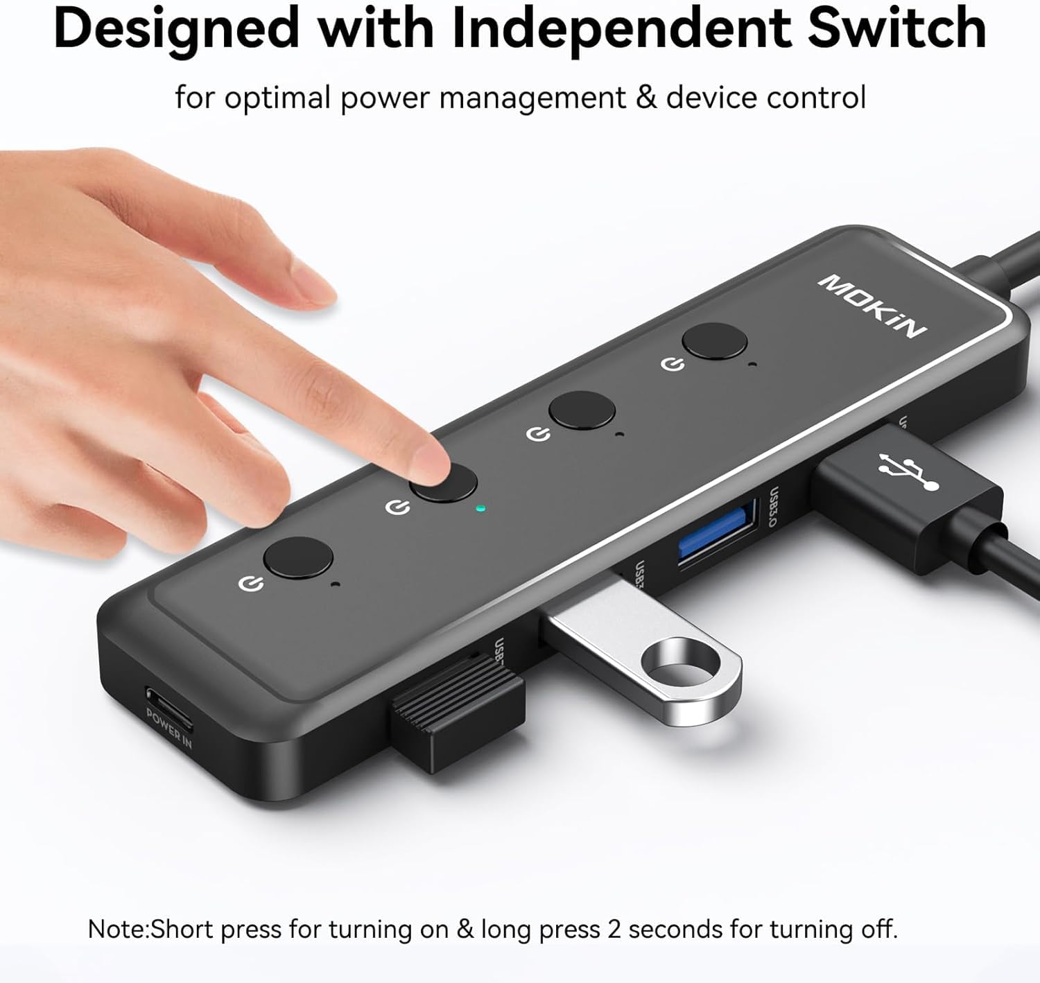 Extend 4 USB 3.0 Ports: MOKiN USB Hub extends your device with 4 additional USB 3.0 ports, ideal for connecting USB peripherals such as flash drive, mouse, keyboard, printer. Note: This USB C port (with IN 5V printed) can not be used for data transfer and charge other devices; It can only supply power for the other 4 USB A ports, which can make data transfer more stable.