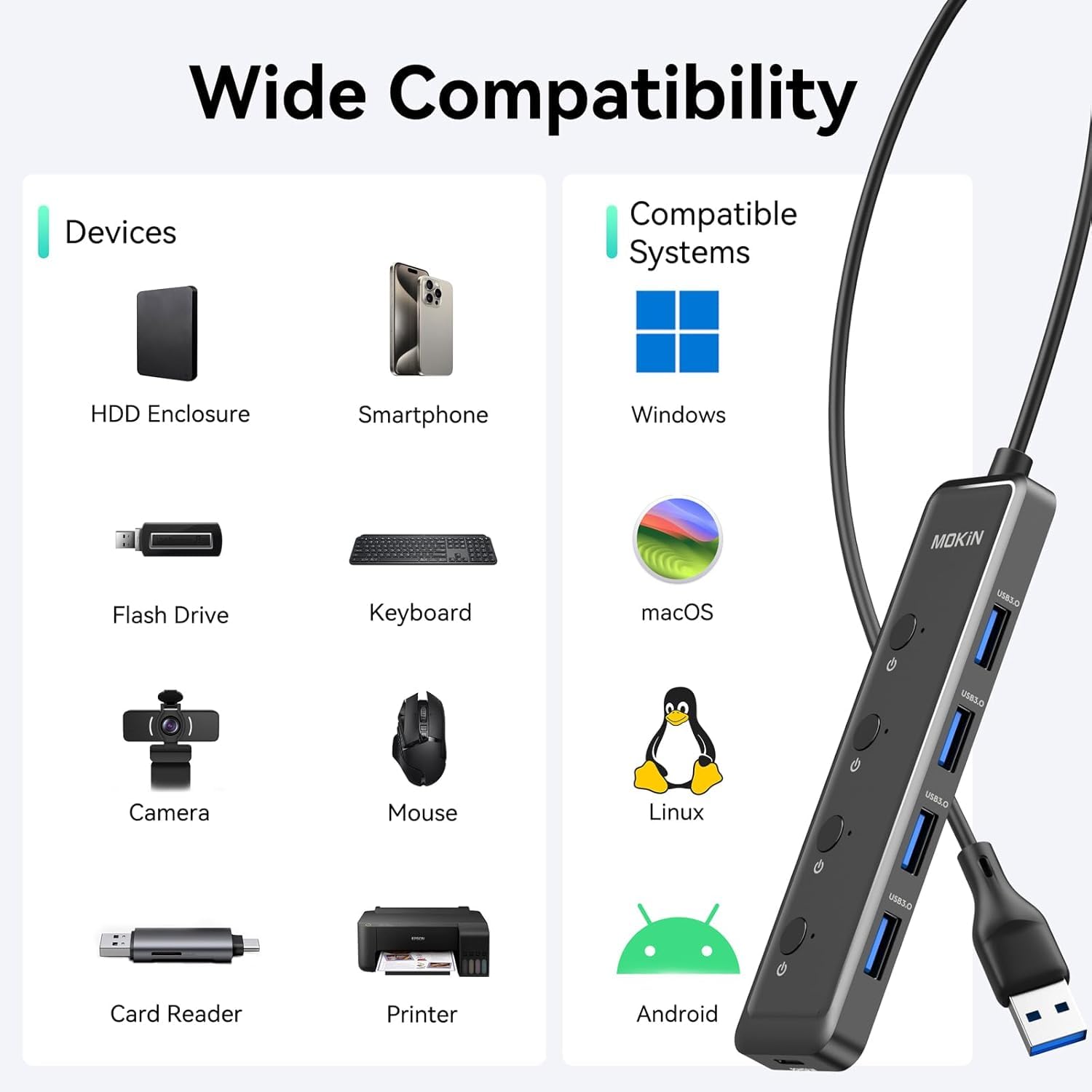 5Gbps High Speed: With this MOKiN USB A 3.0 hub, you can transfer HD movies or large files in just seconds with super fast data transfers of speed up to 5Gbps, 10X faster than USB 2.0 (480 Mbps).