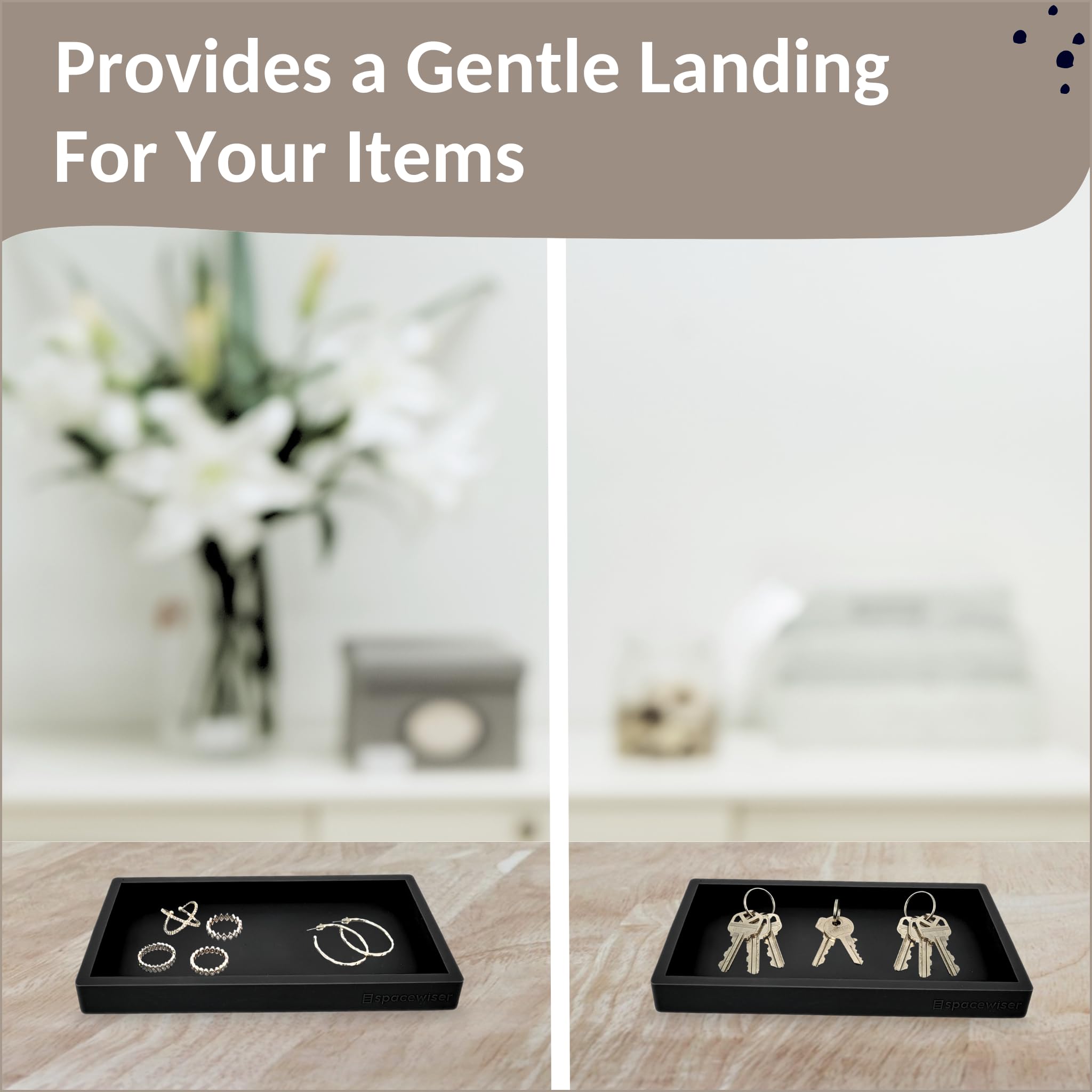 Use Them Anywhere - Choose the endlessly useful and aesthetically pleasing trays that work anywhere. Spacewiser Original Silicone Trays are made of premium food grade silicone, without the addition of potentially unsafe thickening and hardening agents or chemicals. They’re shatterproof, waterproof, slip-resistant, heat resistant to 425F, and dishwasher safe. Spacewiser Original Silicone Trays are perfect as a bathroom tray, vanity tray or soap dispenser tray.