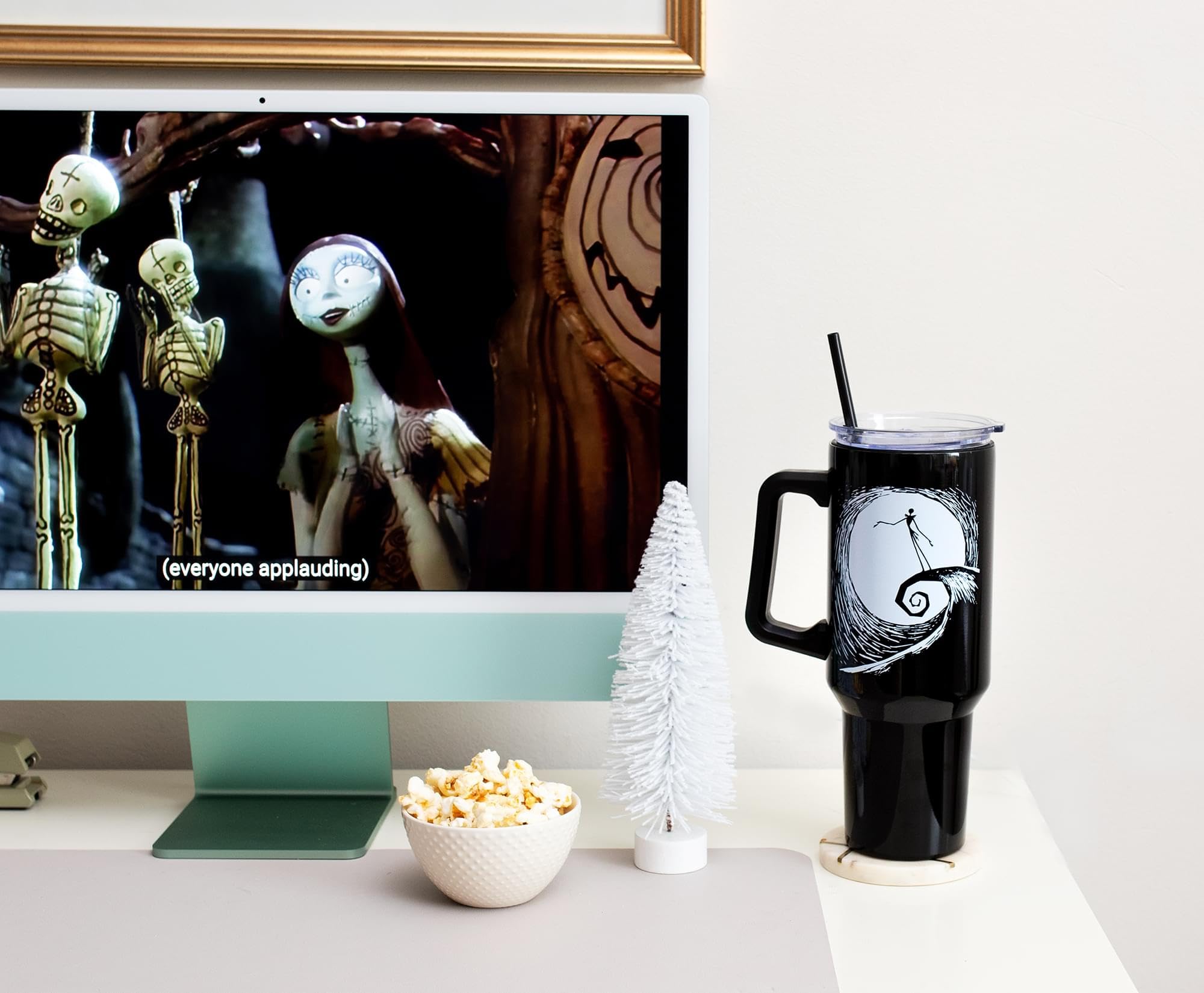 DOUBLE-WALLED STAINLESS-STEEL TUMBLER: Our tumbler holds 40-ounces of your favorite beverage. Keep your drink hot or cold in this Disney NBC Spiral Hill Moon Jack Stainless Steel Tumbler 40 Ounces. Double Wall Stainless Steel Stemless Tumbler with handle.