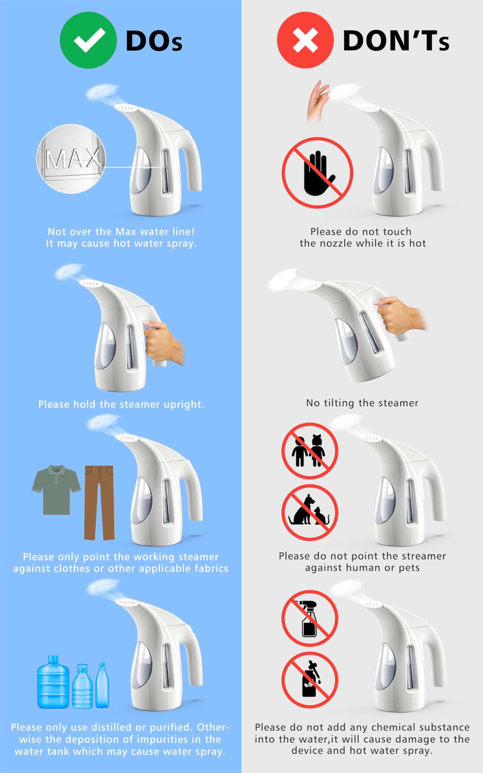 [Power Requirement] Hilife Garment Steamer only use in 110-120V countries and regions such as the US, Canada, Japan. However, Plugging into a 220V-240V or not 110-120V outlet will damage the product
