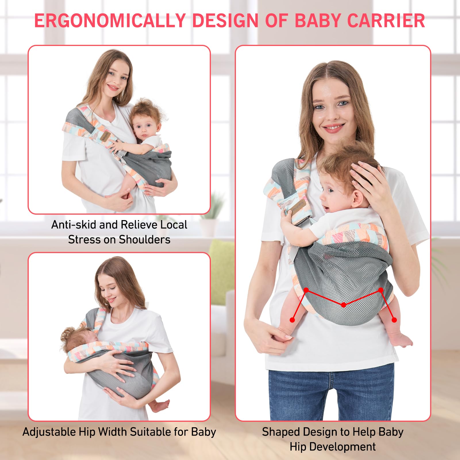 Practical Ergonomic "M" Hip Carrier - Baby Carrier Newborn to Toddler: The baby carrier infant has two separate shoulder straps with padding, which not only has anti-slip effect, but also can share the baby's weight and reduce the pressure on mom and dad's shoulders. The stable hip design of baby sling carrier conforms to the law of baby's bone growth and provides the bebes with correct and comfortable posture, which is conducive to baby's bone development and promote parent-child relationship
