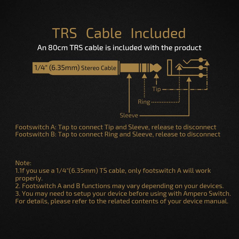 Great external foot switch for Ampero guitar effect pedals and other multi effect pedals or digital devices. For other brand products, please confirm if it can takes momentary switches by TRS connection, If Yes, our ampero switch is Ok for you.