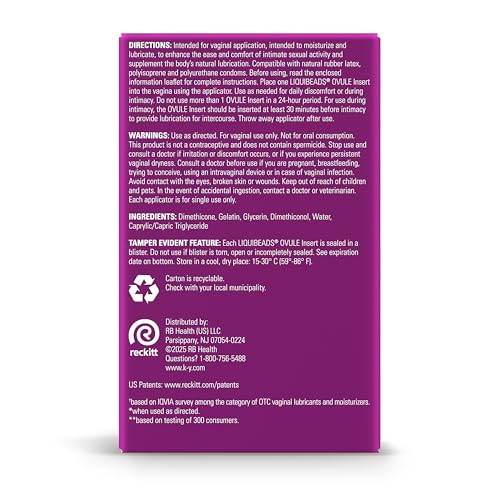 K-Y Liquibeads are a silicone based vaginal moisturizer & lube that help reduce pain due to vaginal dryness and provide long-lasting comfort. This ovule insert has a less-mess formula that hydrates the intimate areas with the highest quality silicone. After being inserted, the outer ovule begins to dissolve in minutes, gently releasing soothing lubrication to enhance your intimate comfort, even during menopause. Designed to supplement the body's natural lubrication & feel like your own natural vaginal moisture. Specially formulated to reduce discomfort due to vaginal dryness. K-Y Liquibeads vaginal lubricant are not made with alcohol, fragrances, hormones, or parabens. These vaginal suppositiories are easy to use & discreet so no one has to know you're using them. We know your vaginal care is no one else's business - that's why they're also delivered in discreet plain packaging, ensuring your comfort every step of the way. This product contains 6 ovule inserts & 6 disposable applicators. Say goodbye to messy, reusable vaginal cream applicators. K-Y is the #1 Doctor recommended personal lubricant brand*. *among vaginal lubricants & moisturizers, IQVIA, ProVoice Survey, Dec. 2023