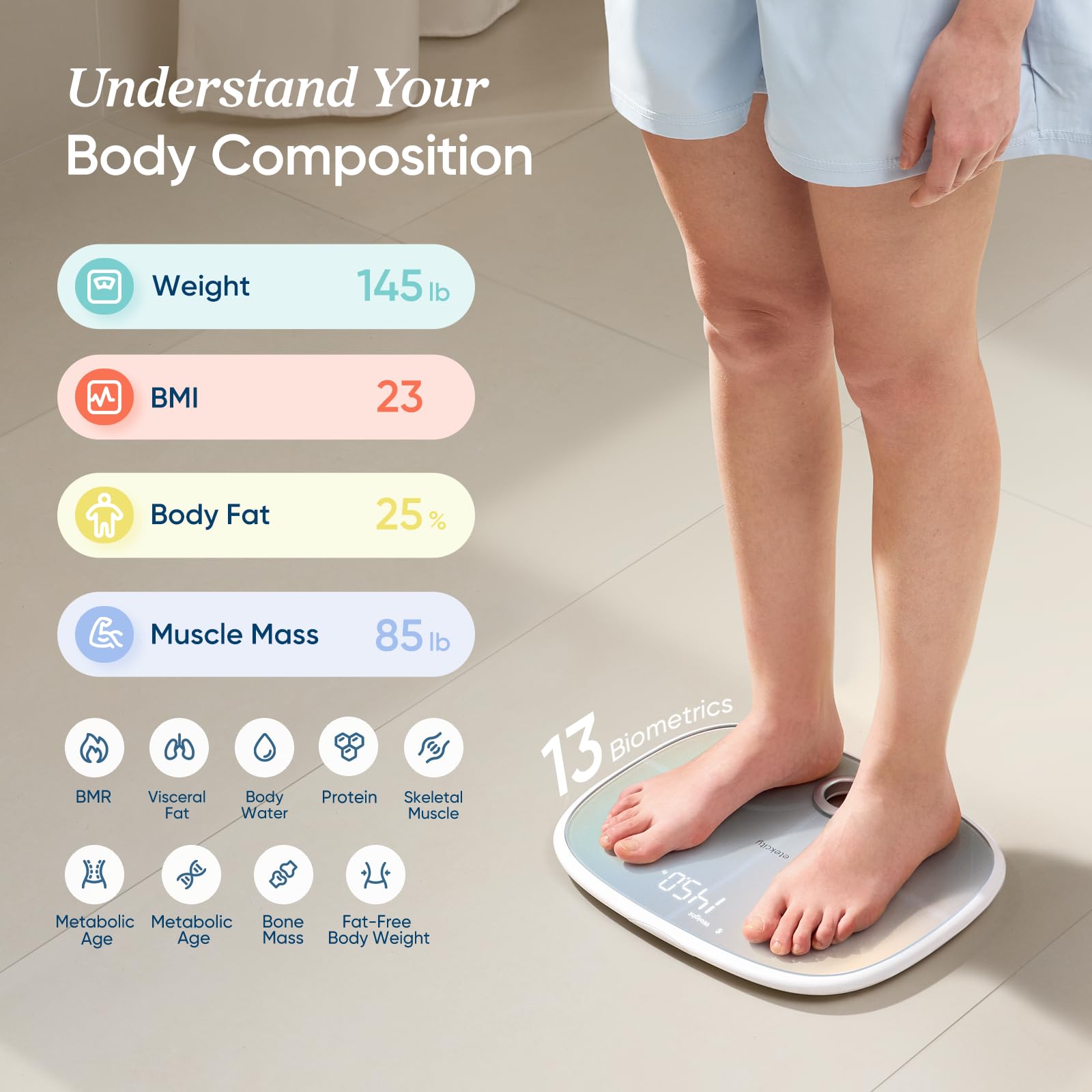 ๐๐ผ ๐๐ฒ๐๐ผ๐ป๐ฑ ๐๐ต๐ฒ ๐ฆ๐ฐ๐ฎ๐น๐ฒ: Track 13 key indicators, including Weight, BMI, Body Fat, and Muscle Mass. Accuracy down to 0.1 lb to track the progress your body is truly making