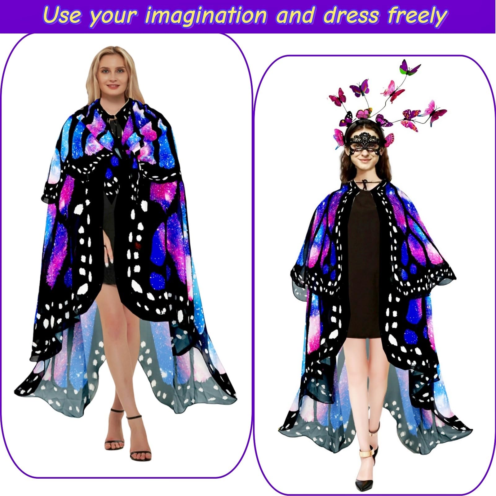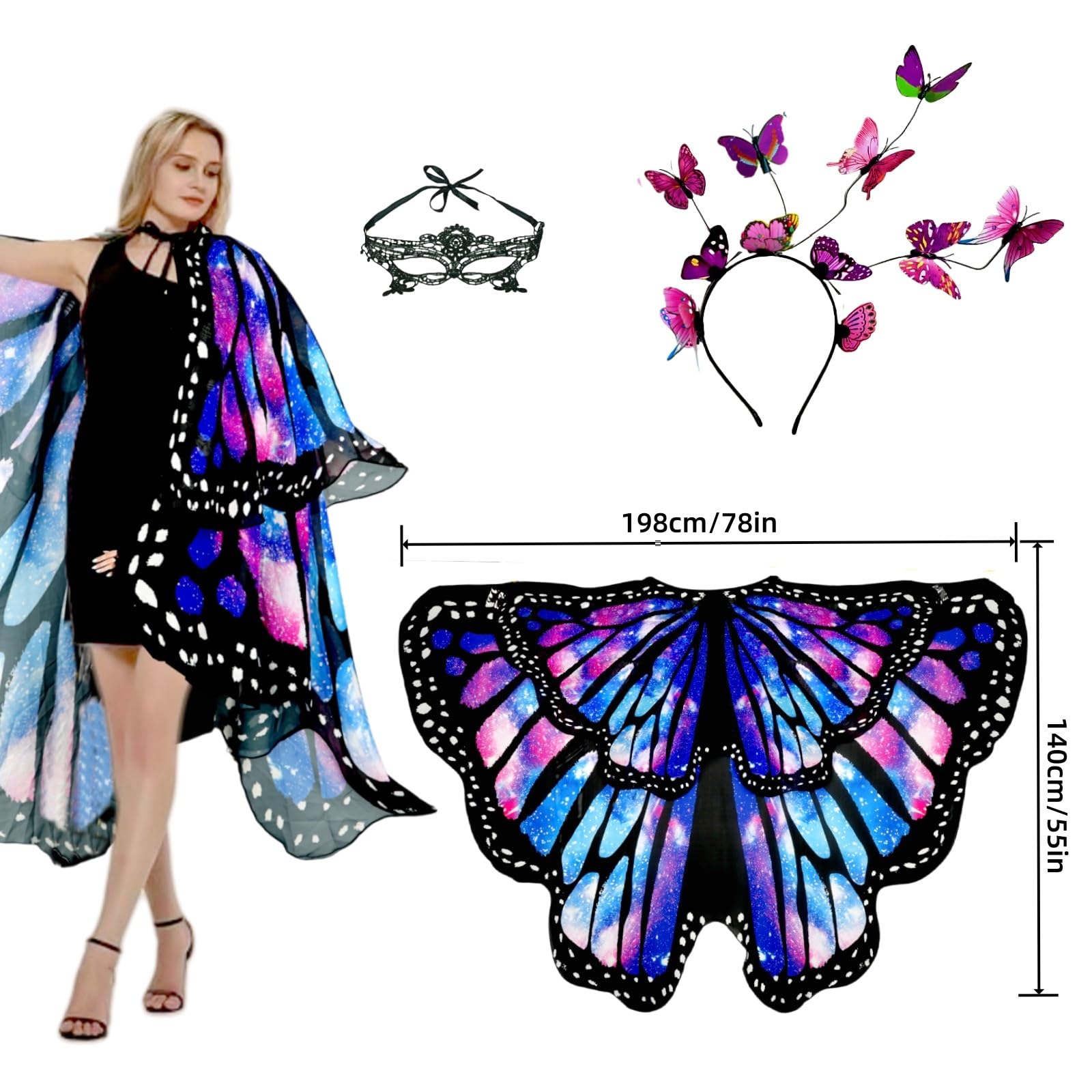 Halloween Party Dress-Up, Butterfly cape is made of high quality chiffon, breathable and comfortable, Skin-friendly,No Fading.The brightly colored butterfly headband,The lace visor can be adjusted for elasticity. A halloween gift for your family and friends.