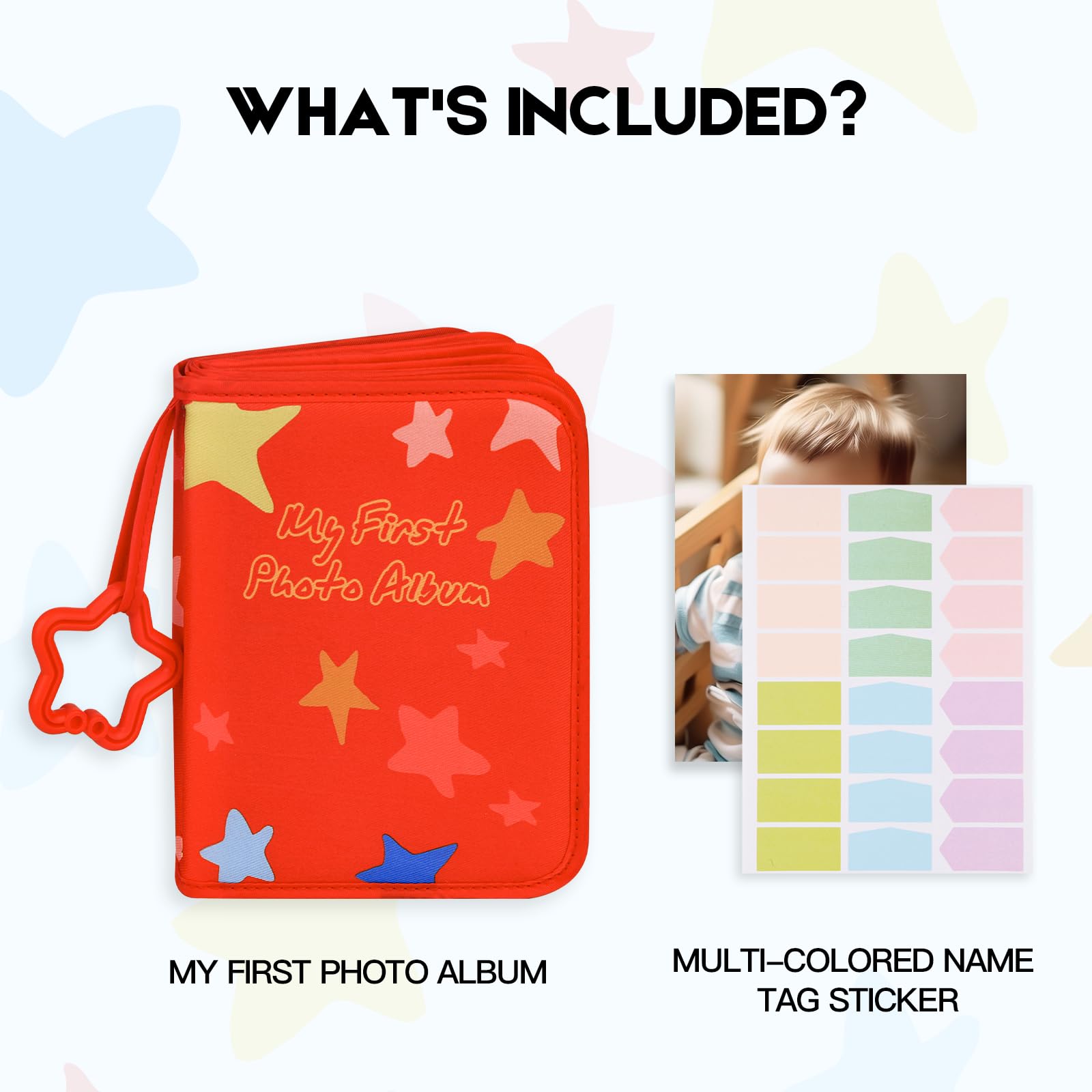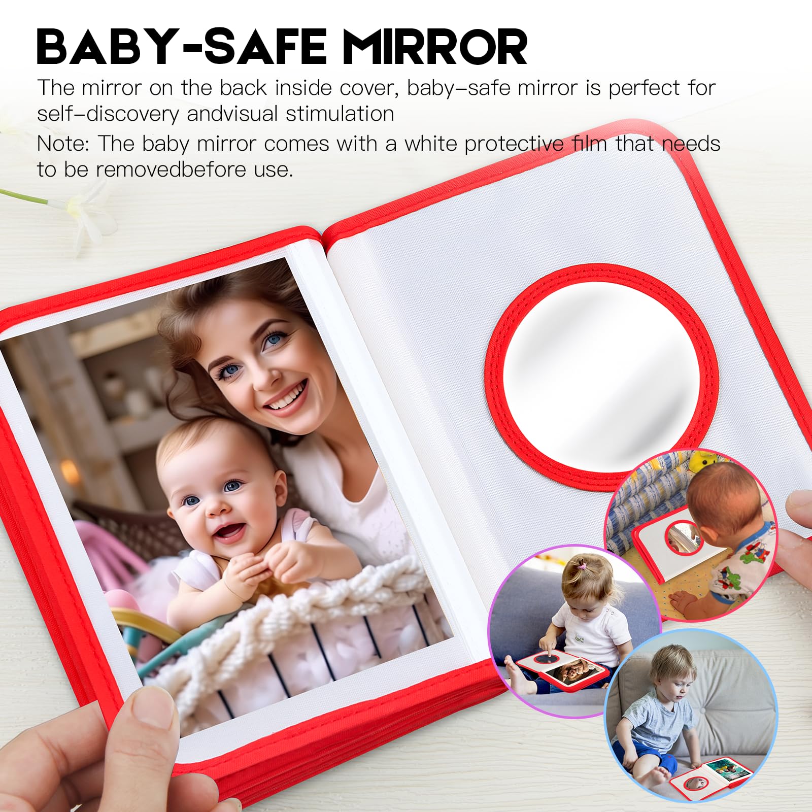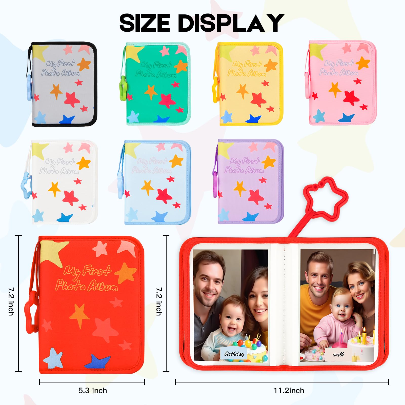 PERFECT SIZE: This small baby photo book is perfect for baby's tiny hands. Holds up to 21 4x6 inch photos. Clear photo pockets, can protect pictures from baby's drool, pictures won't stick to pockets, easy to insert and remove. The star hook can be easily attached to the cot, pram, etc. Child safety mirror on one side in the middle of the last page of the album.