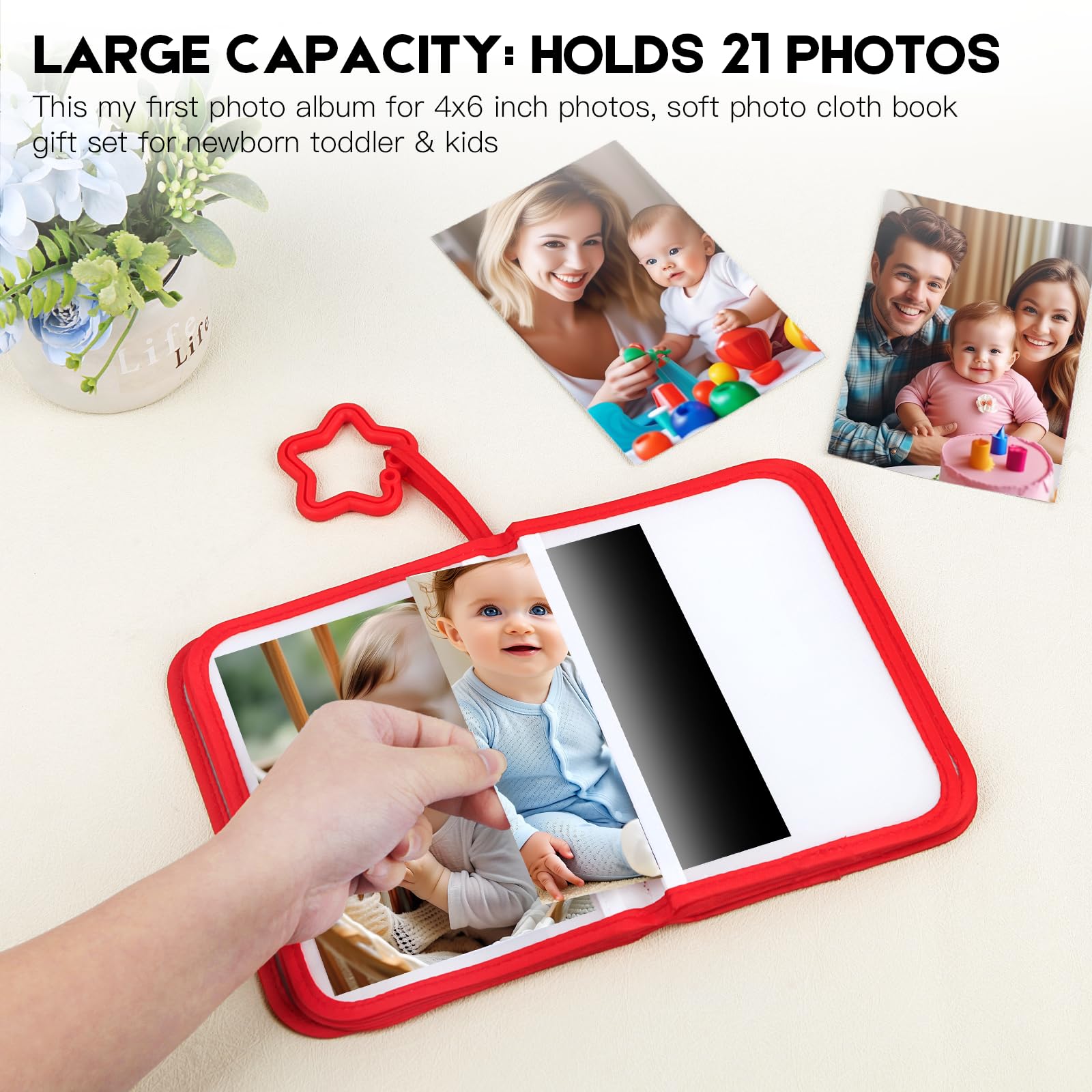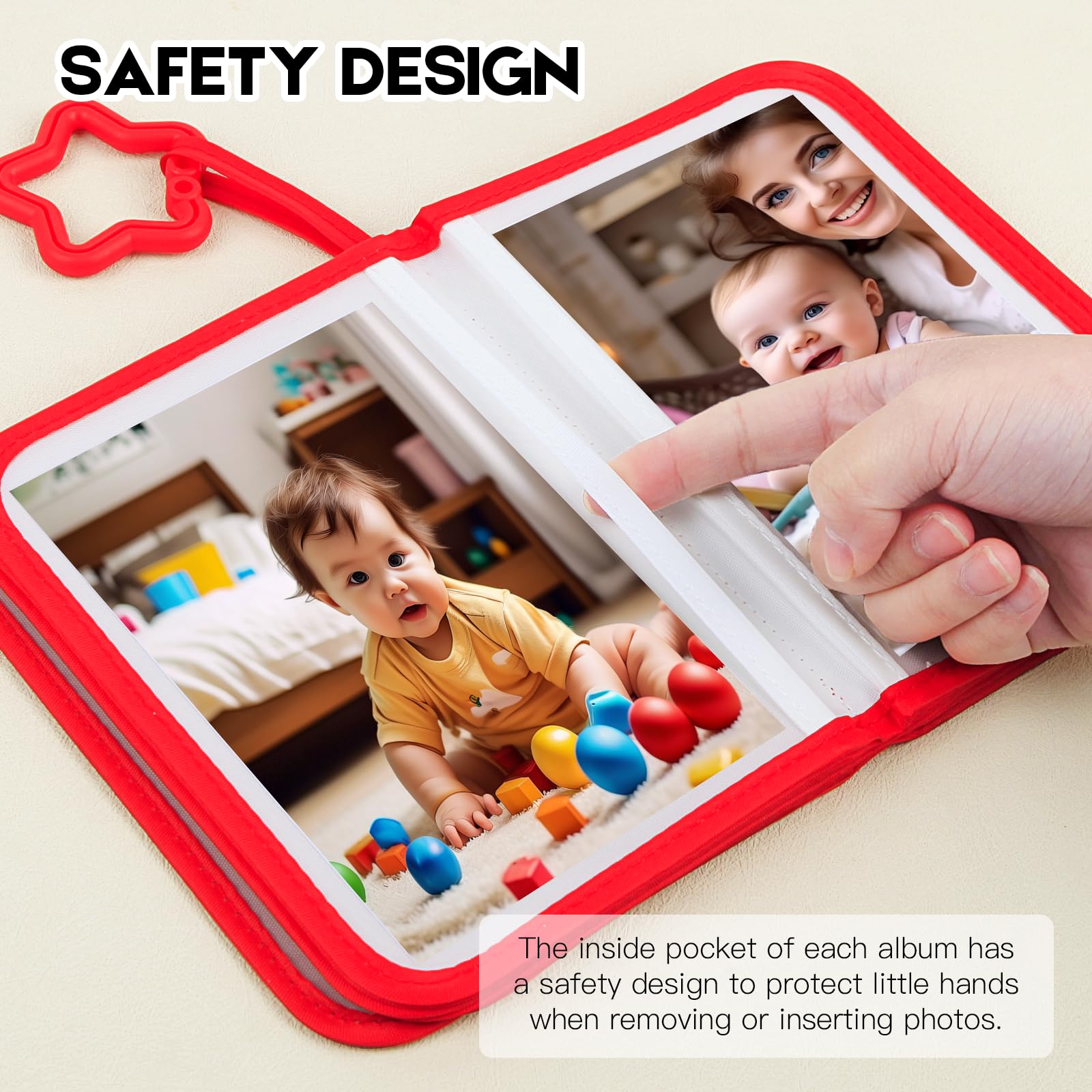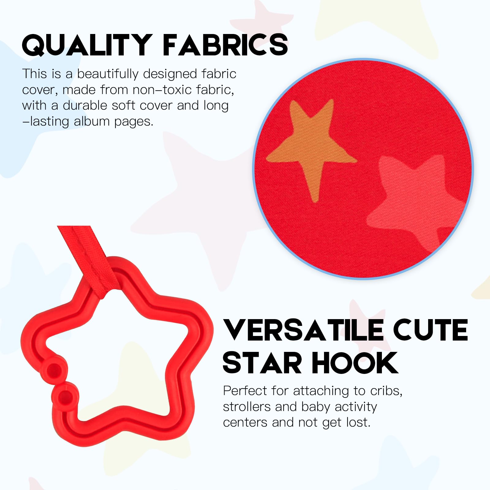 PERFECT SIZE: This small baby photo book is perfect for baby's tiny hands. Holds up to 21 4x6 inch photos. Clear photo pockets, can protect pictures from baby's drool, pictures won't stick to pockets, easy to insert and remove. The star hook can be easily attached to the cot, pram, etc. Child safety mirror on one side in the middle of the last page of the album.