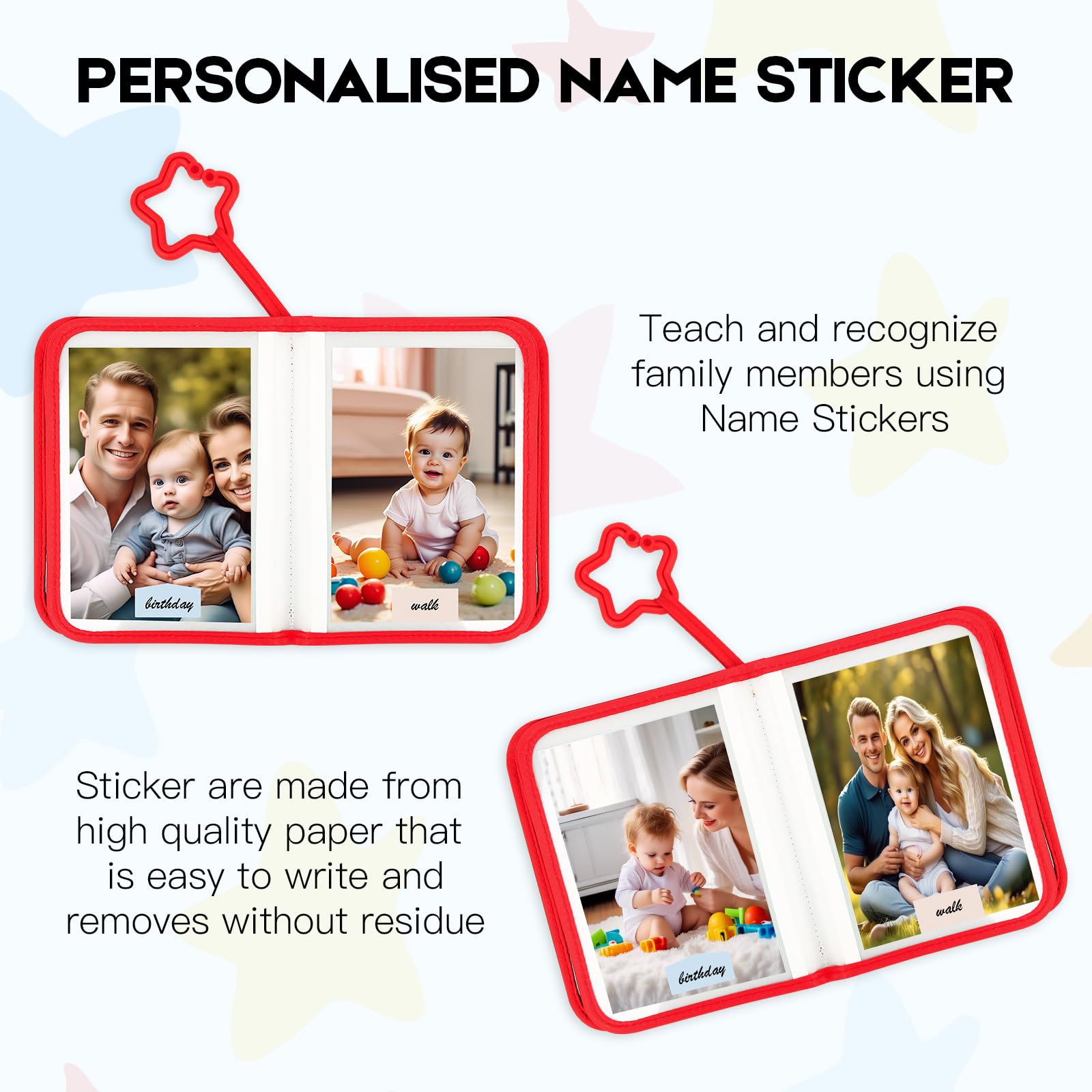 NAME TAG STICKERS: Cultivate children's imaginations and stimulate their curiosity, using family photos with name tags helps promote early brain development, social skills, literacy and communication skills. The familiar faces in this baby photo book help to stimulate the brain. Photographs and baby-safe mirrors stimulate your child's imagination and curiosity. The soft photo book is a great way to teach your baby about family members.