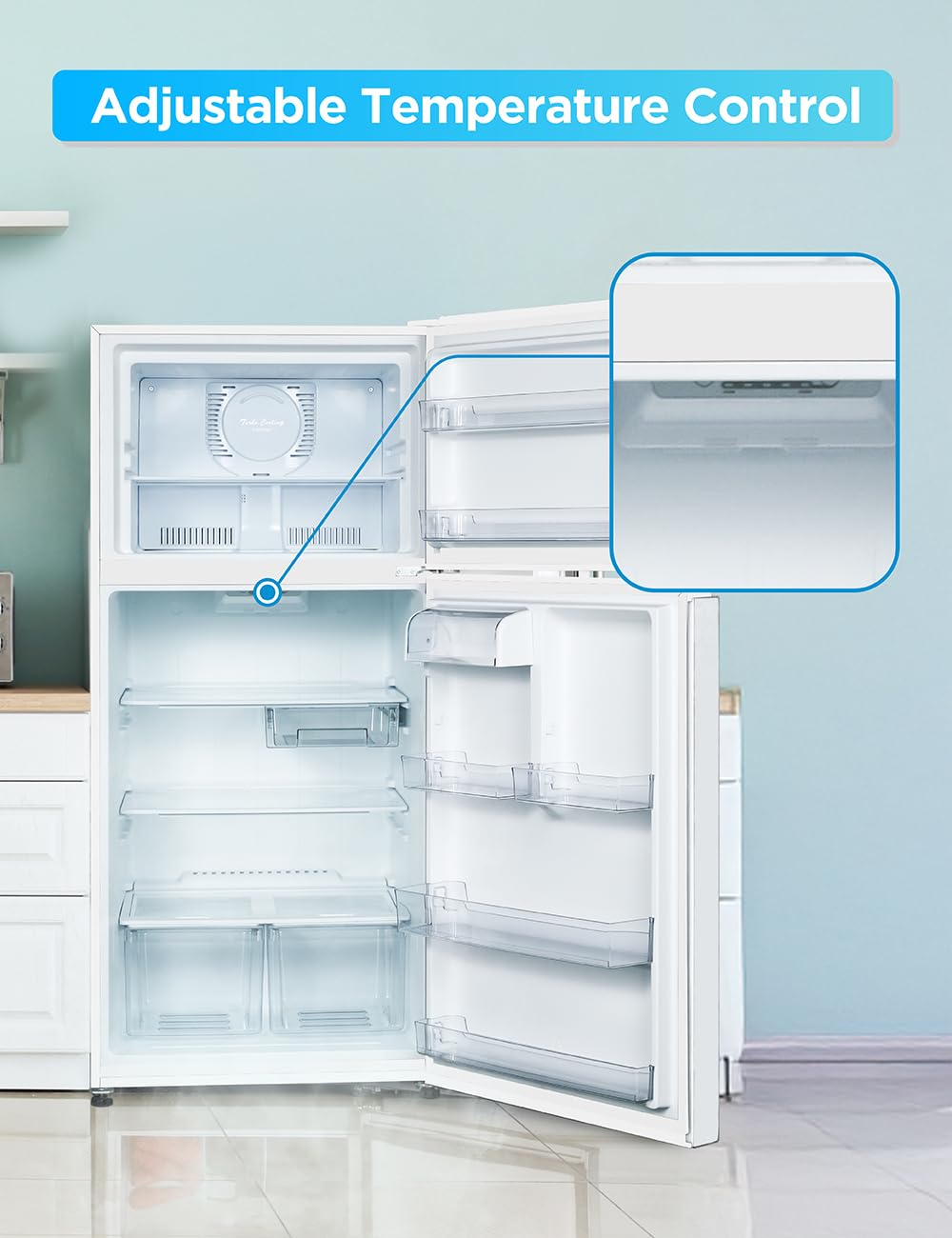 Independent Temperature Control: Maintain optimal freshness with the adjustable temperature control feature. Set the perfect climate levels for both the refrigerator and top freezer sections
