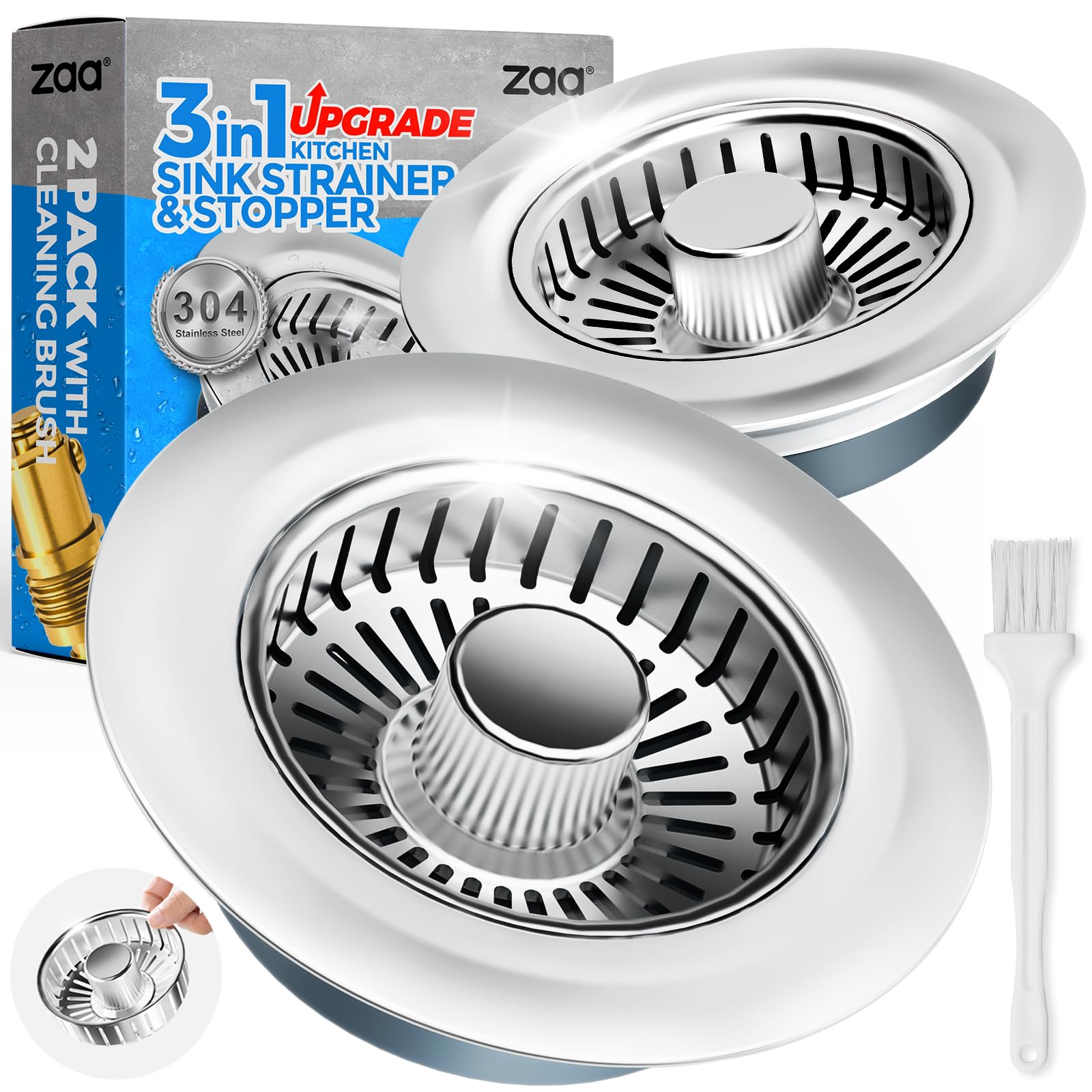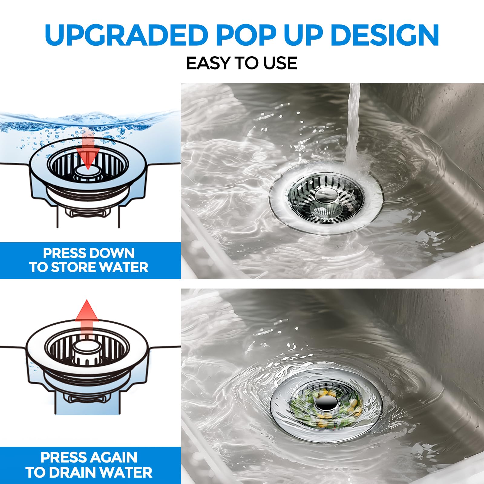 【Prevent Clogs & Ensure Smooth Drainage】Our 3 in 1 kitchen sink drain strainer, combines sink drain strainer, kitchen sink stopper and odor isolation together. Press down the pop up button to store water for washing, press again to drain water while catching food waste or scrap from going down the drain. A reliable anti clogging helper and a must have kitchen sink installation parts