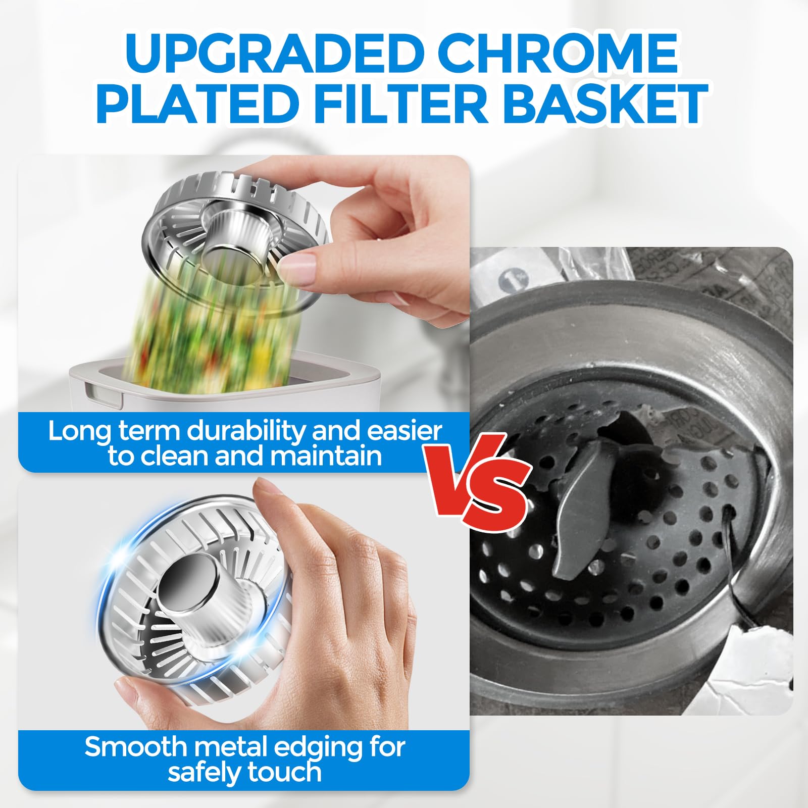 【Never Clean a Clogged Basket Again】Say goodbye to frustrating, gunky basket filters! Our anti-clogging kitchen sink strainer features a premium Chrome Plated Filter Basket. Its specially designed holes effortlessly filter water while letting scraps slide off easily during disposal – no poking, no stuck bits, and hands stay clean. Enjoy smooth drainage every time! Please note: Oil buildup over time can make the drain strainer slippery, causing difficulty when removing the basket. Regularly clean the strainer with hot water and detergent to maintain grip