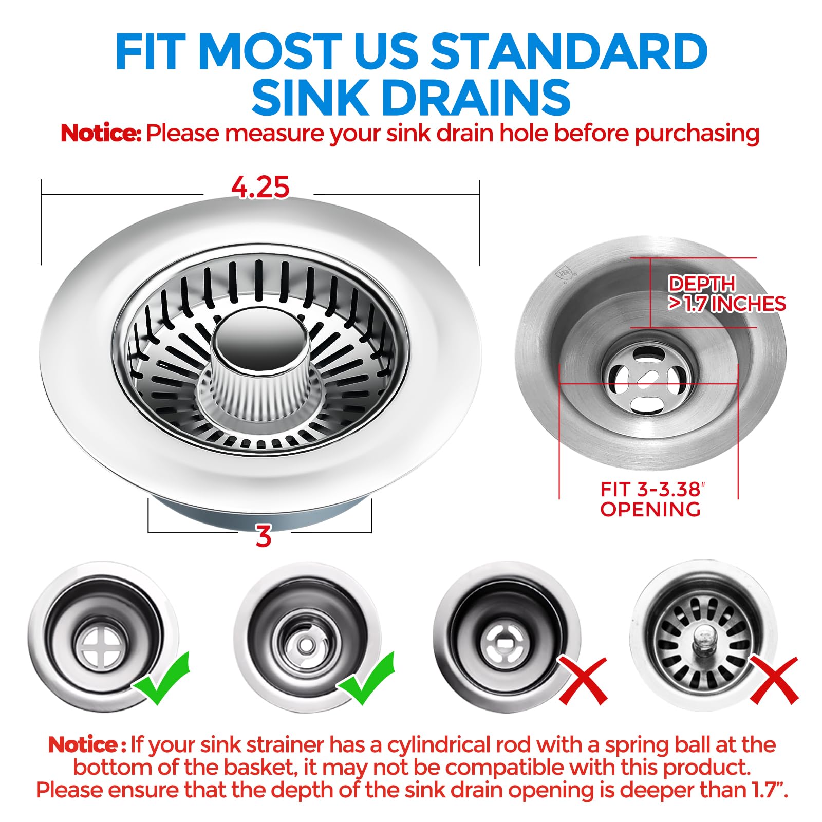 【Fit US Standard Sink Drains:3-3.38"】Worried about compatibility? Rest easy! This kitchen sink stopper is designed to fit most US standard 3-1/2 inch kitchen drain holes (measuring 3-3.38"). Pro Tip: Quickly measure your drain before ordering for guaranteed perfect fitment