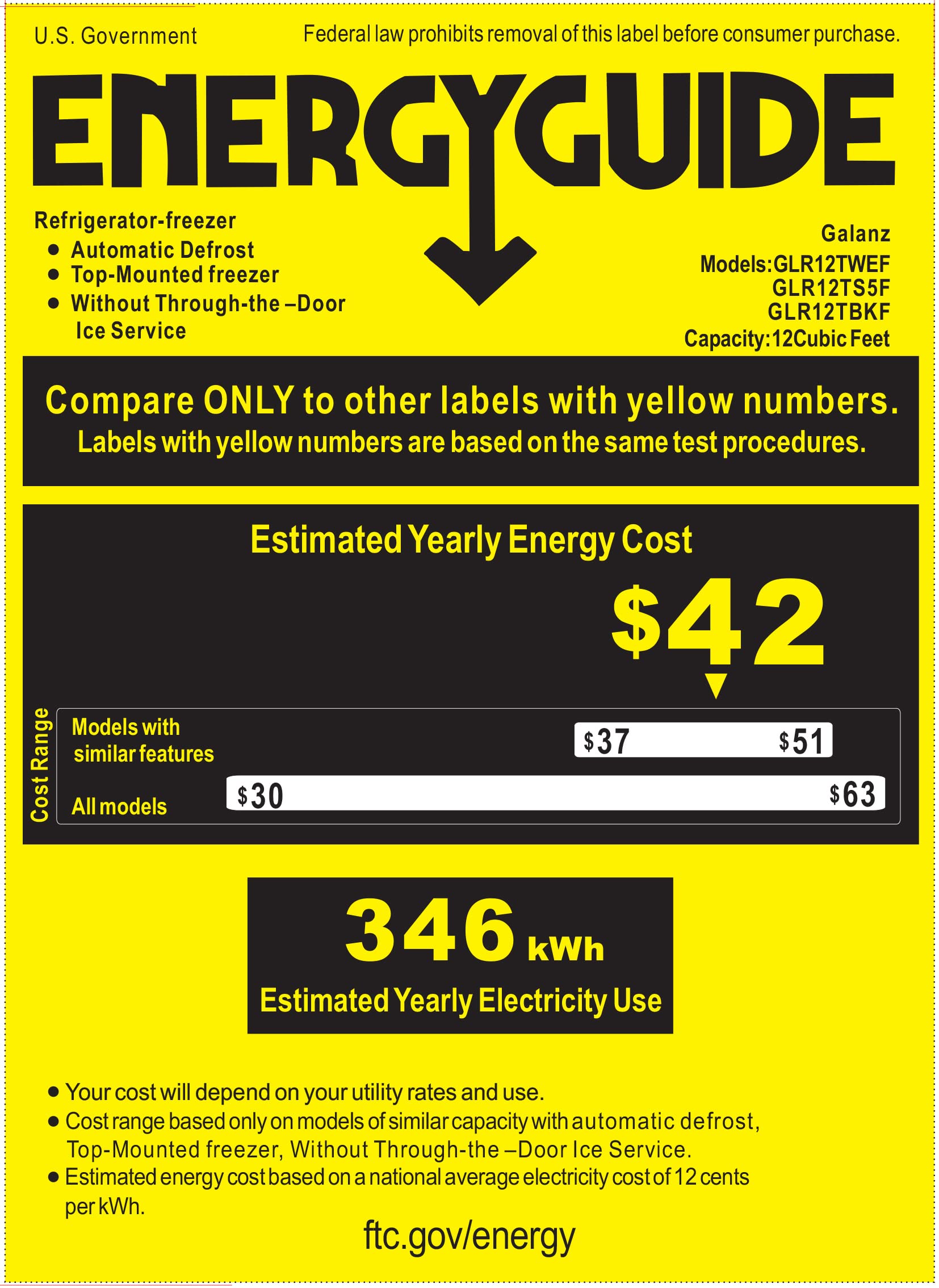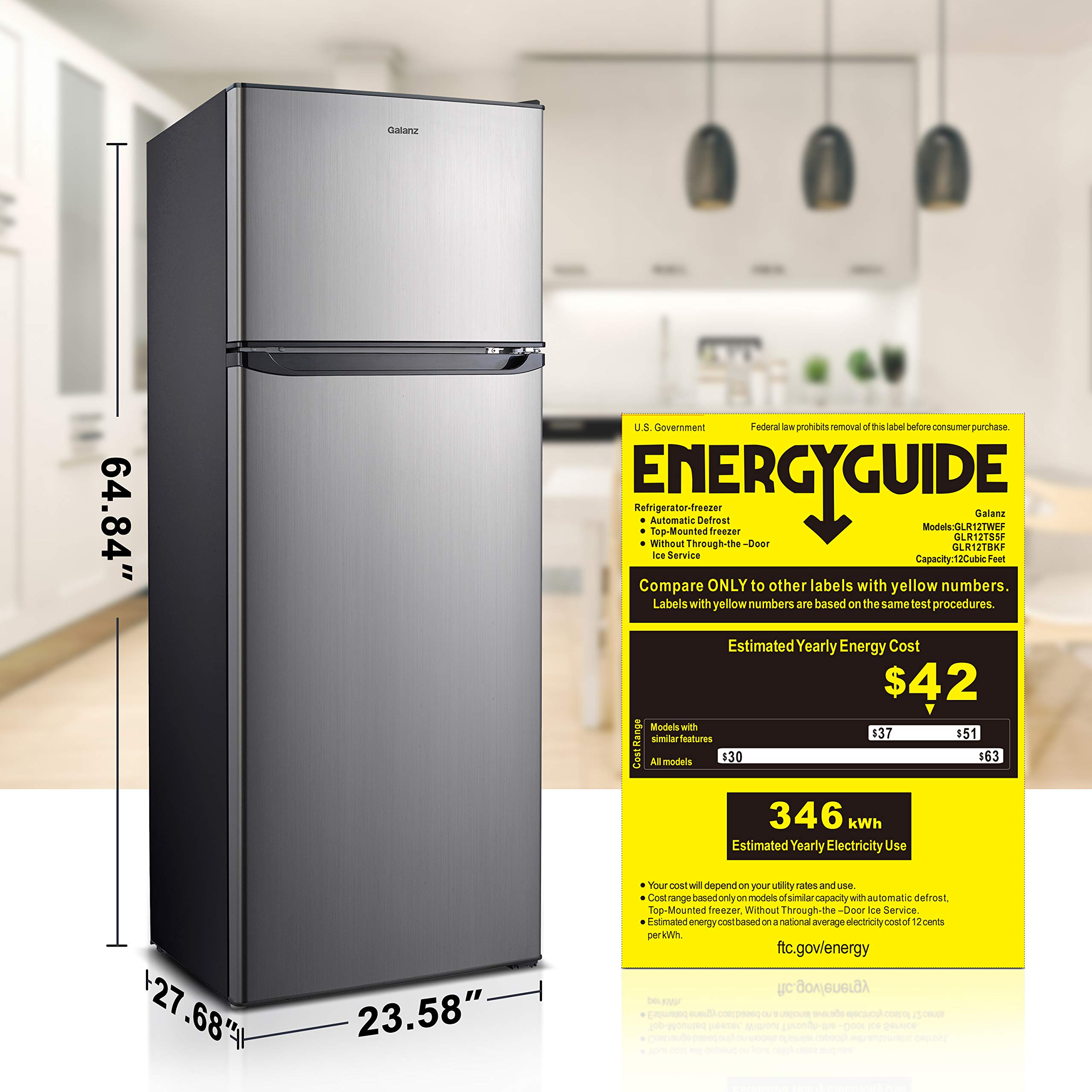 SPACE SAVING & LARGE CAPACITY: This top mount refrigerator with 23.58*27.68*64.84 inches measurement and 12.0 cubic feet capacity is perfectly sized to keep your favorite beverage cool, fruit or other food fresh, while taking up minimal space in your college dorm, RV, apartment, garage, camper or basement..Amperage : 1.2 amps