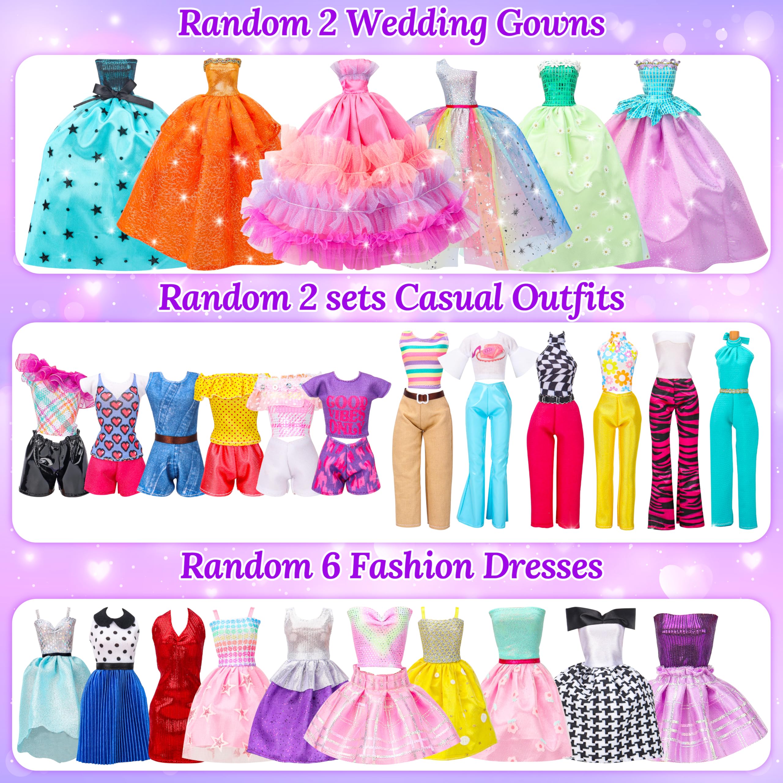 【Product List】1 Doll Closet + 2 Wedding Gowns + 6 Fashion Dresses + 2 Sets Casual Outfits + 2 Swimsuits + 20 Cloth Hangers + 10 Pair of Shoes + 17 Accessories + 10 Rubber bands(Clothes & Shoes & Accessories are random styles,fit for 11.5 inch dolls,dolls not included)