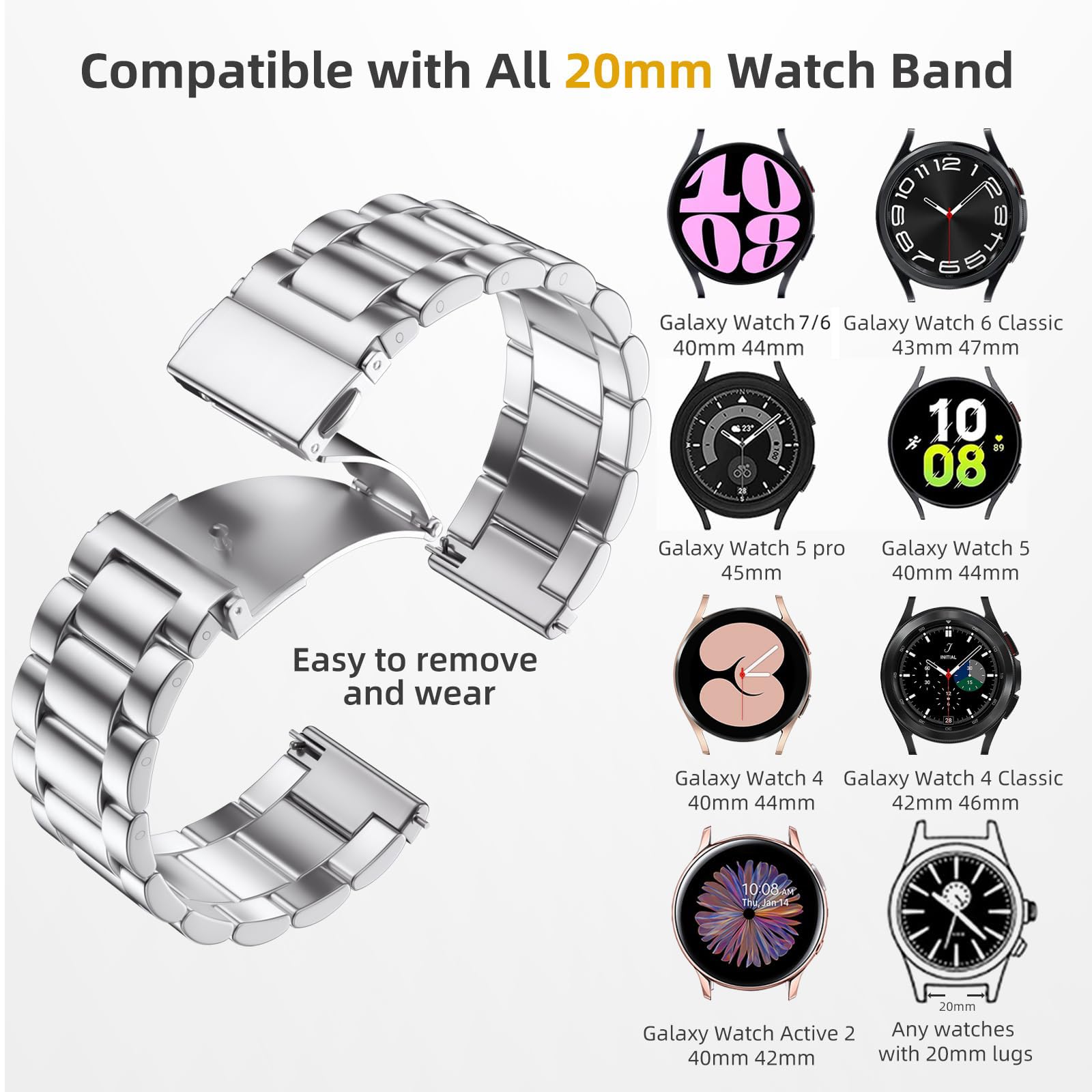 【Compatible with all 20mm watches】Lerobo Metal Elegant Casual Business Band Compatible with Samsung Galaxy Watch 7/6/5/4 FE 40mm/44mm/Galaxy Watch 6 Classic 43mm 47mm/Galaxy Watch 5 Pro 45mm/Galaxy Watch 4 Classic 42mm/46mm/Galaxy Watch Active 2 40mm 44mm/Galaxy Watch Active 40mm/Galaxy Watch 3 41mm/Watch 42mm, Gear S2 Classic SM-R732 / SM-R735 Smart Watch and other watchs with 20mm width watch lugs. PLEASE NOTE: NOT compatible with Samsung Galaxy Watch 8/8 classic