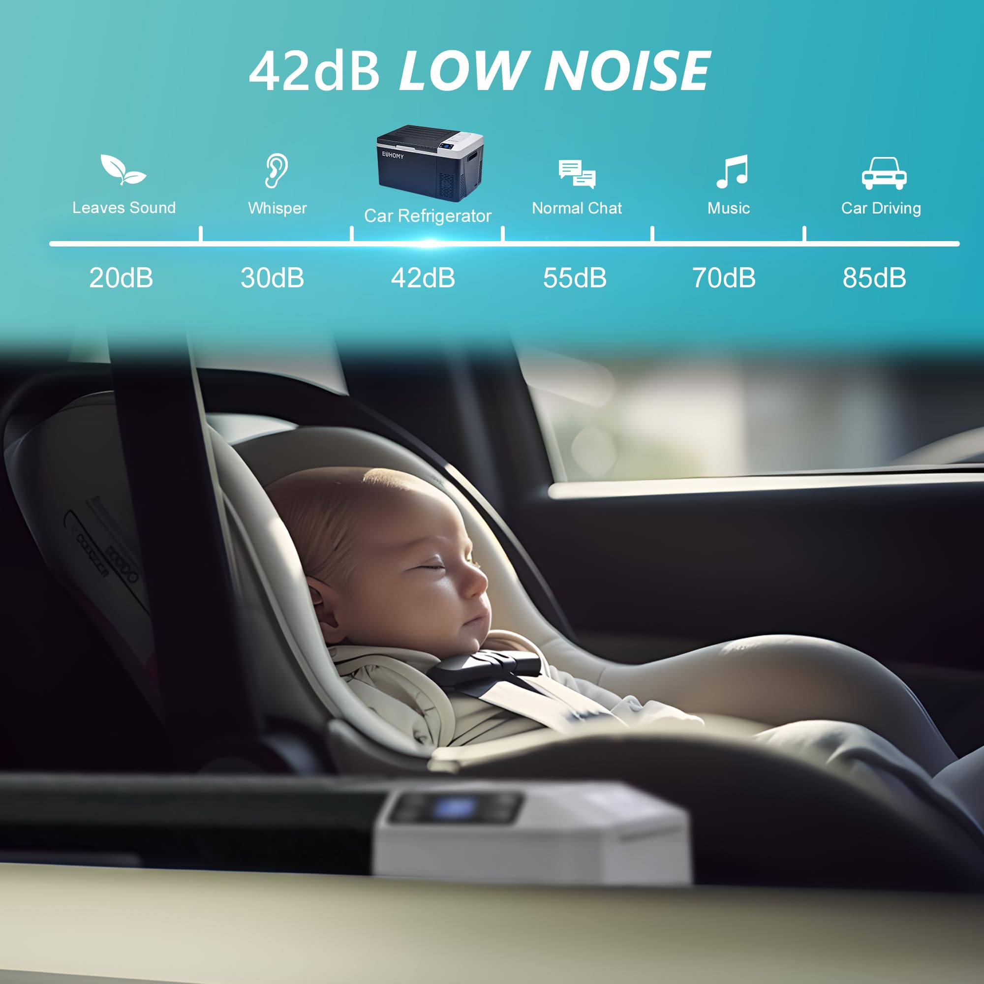 Battery Protection & Multiple Power Supplies; The 12 volt cooler features a three-level battery protection system, adjustable from 9.6V to 12.4V in L/M/H modes, preventing overload or vehicle battery drain. This protection makes the camping fridge suitable for use in sedans, SUVs, trucks, and most other vehicles. It can be powered by either DC or AC, making it versatile for various scenarios