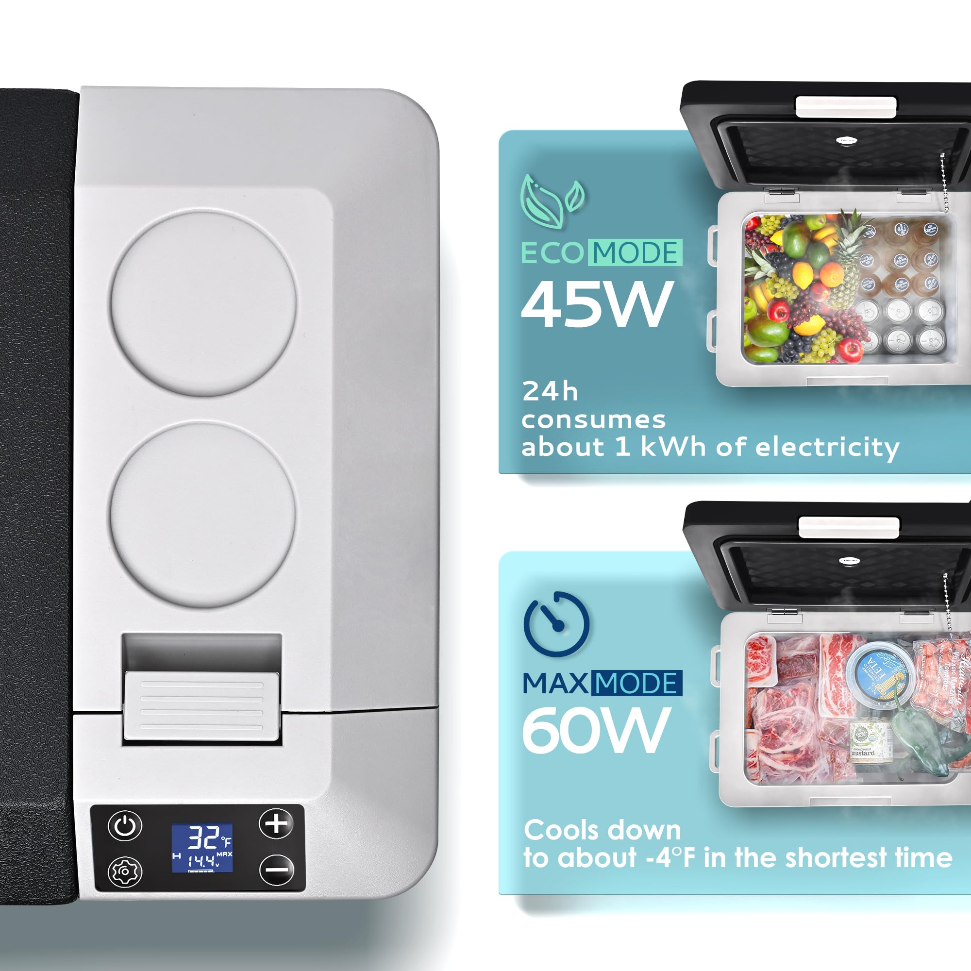 Independent Storage Spacet & Powerful Compressor; This portable refrigerator comes with a specialized compartment that not only acts as a power/charging station, but also serves as a handy storage space for small essentials. The battery powered cooler is equipped with a high-efficiency compressor that cools from 77°F to 32°F in just 15 minutes, with an average energy consumption of just 45W