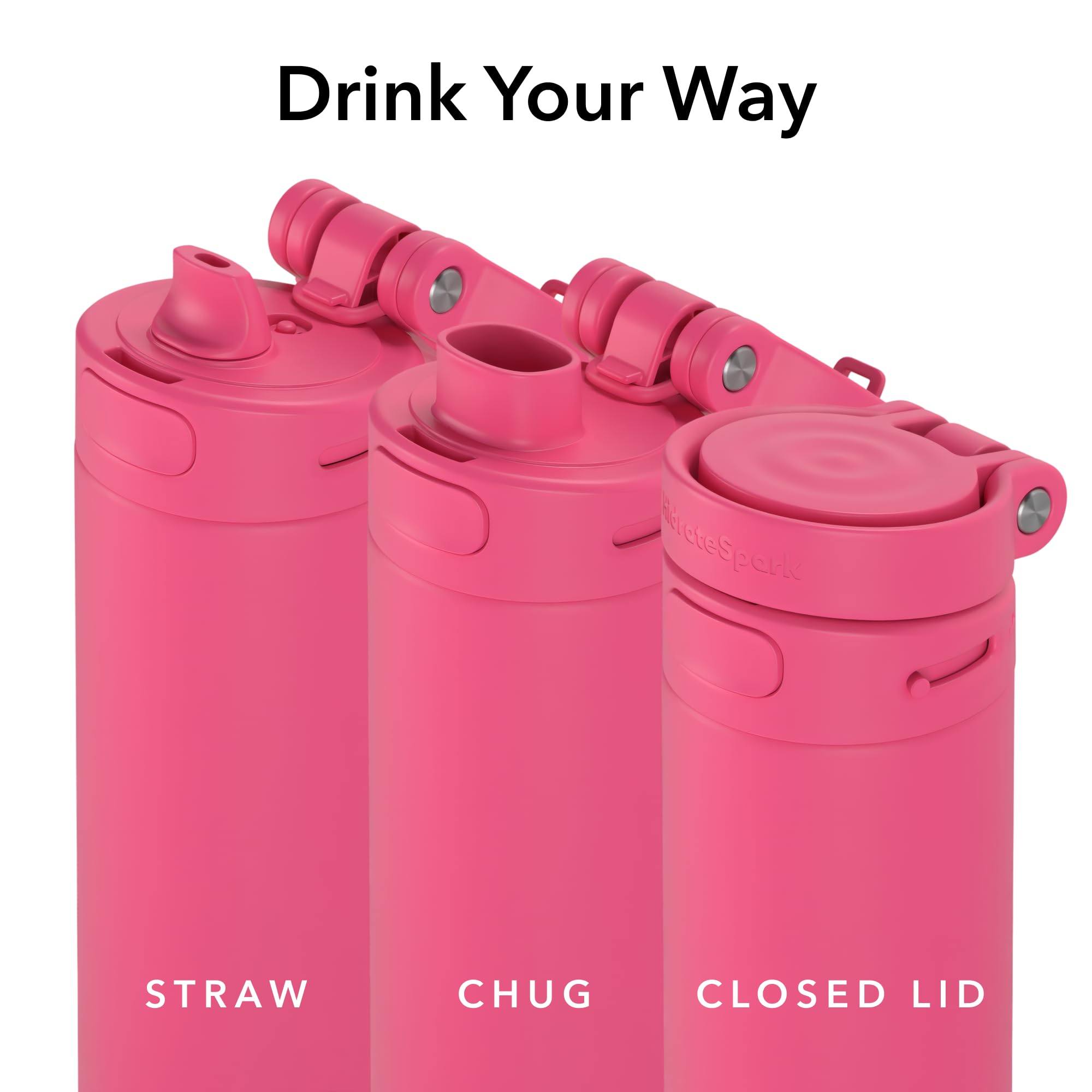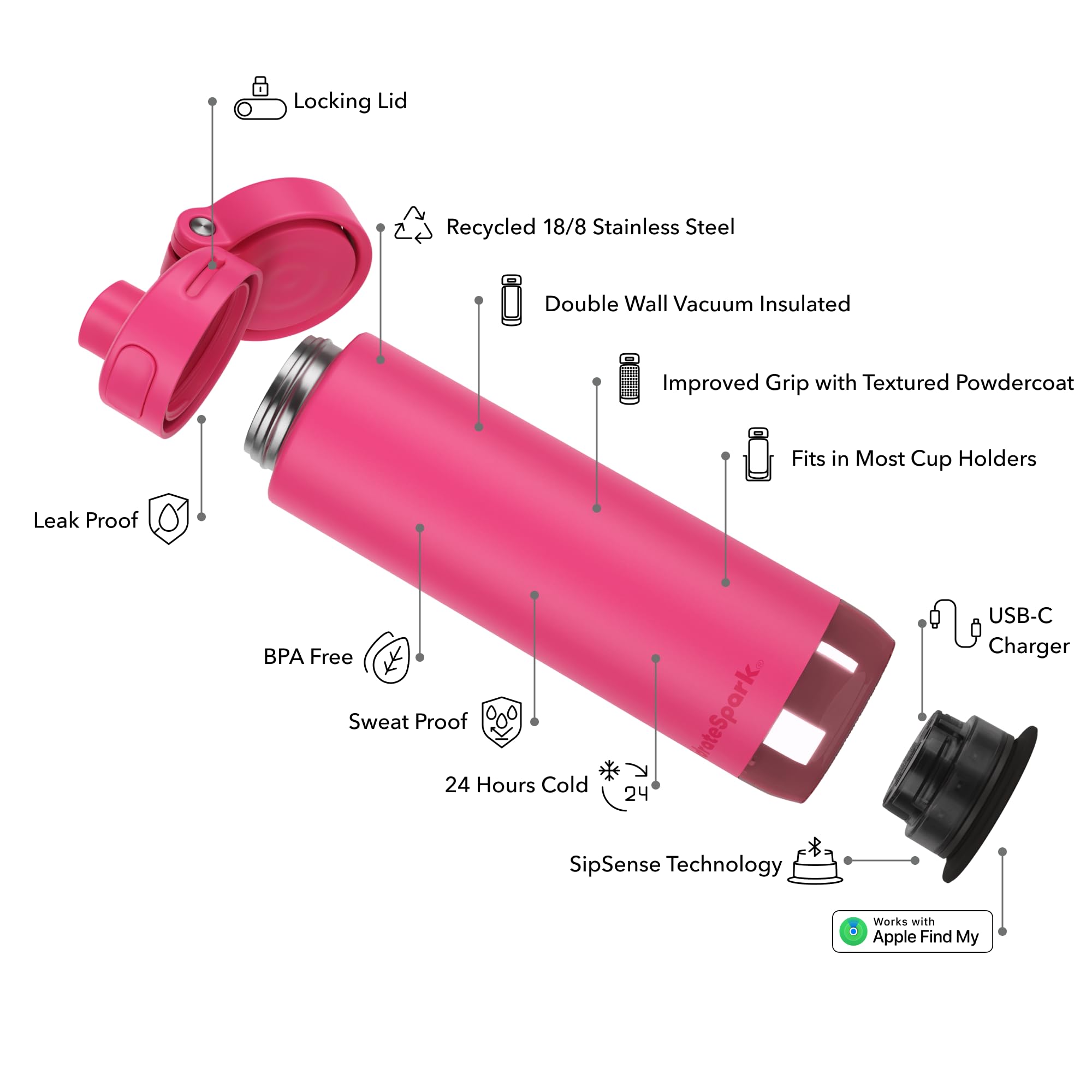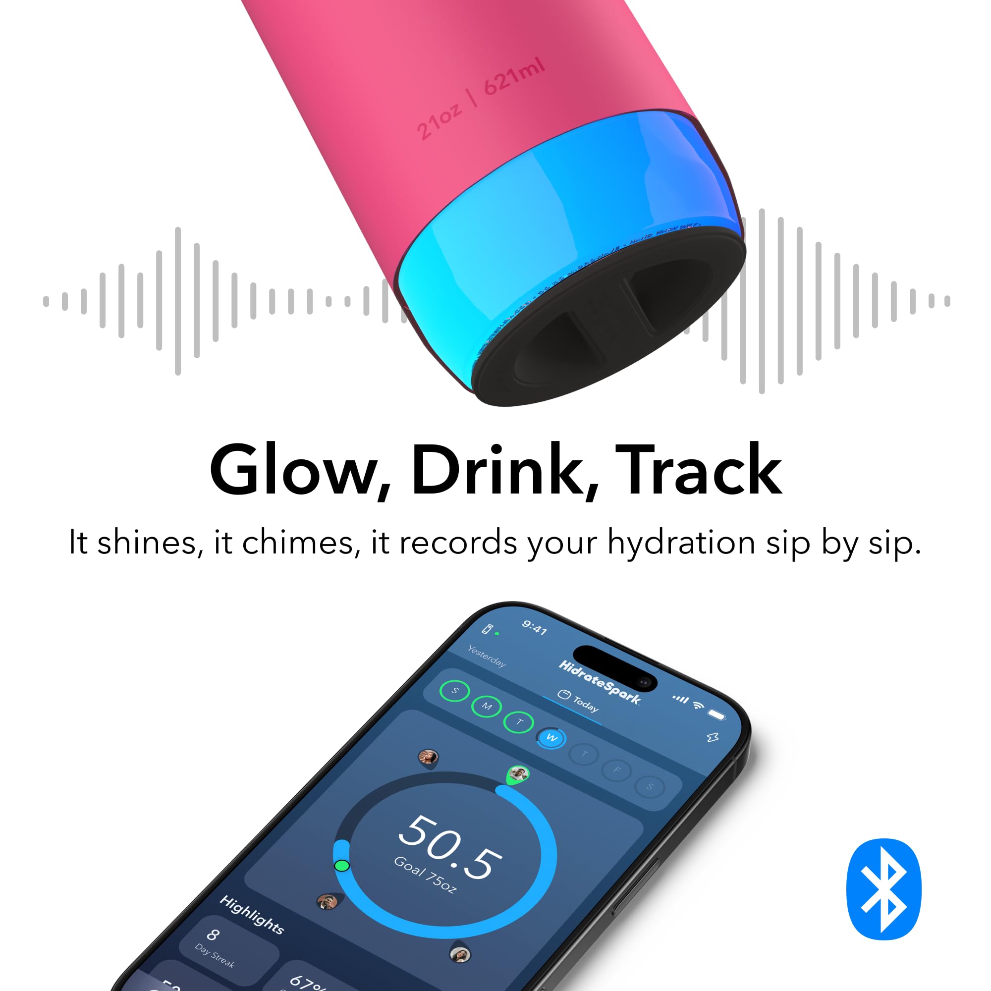 Stay hydrated like never before with the 21 oz HidrateSpark PRO 2, the worldβs smartest water bottle made from premium recycled stainless steel. Double-wall vacuum insulation keeps your drink cold for up to 24 hours, while the SipSense Technology in the sensor tracks every sip and reminds you when itβs time to drink with a customizable 360-degree glow and optional sound alerts. Sync your water intake with the HidrateSpark App via Bluetooth to monitor your progress, set personalized goals, and even locate your bottle using Appleβs Find My Network. The large carry handle and narrow base make it cup-holder friendly and easy to carry wherever you go. Works with the chug or straw lid for ultimate versatility.