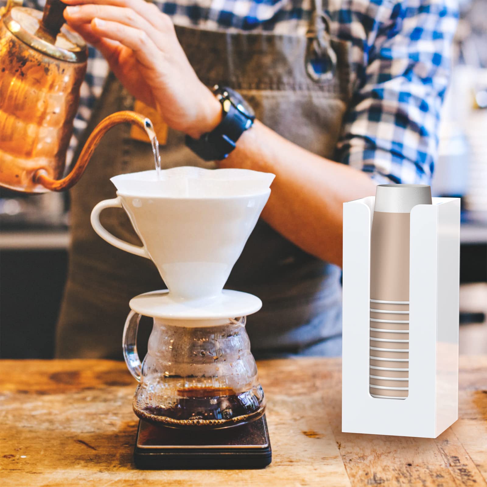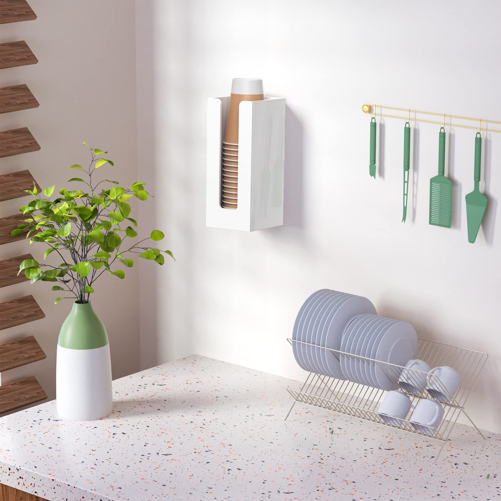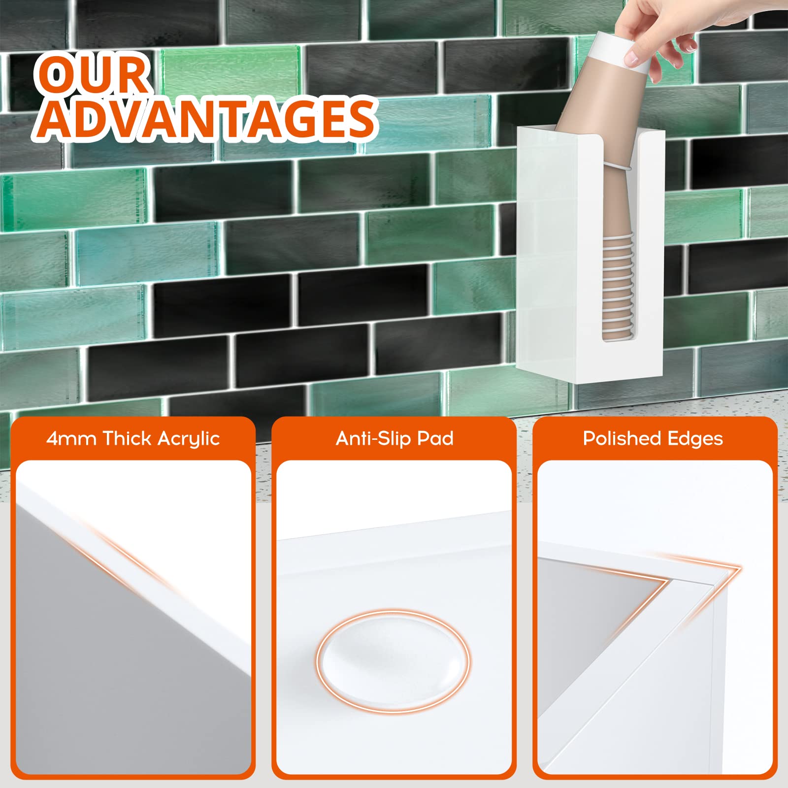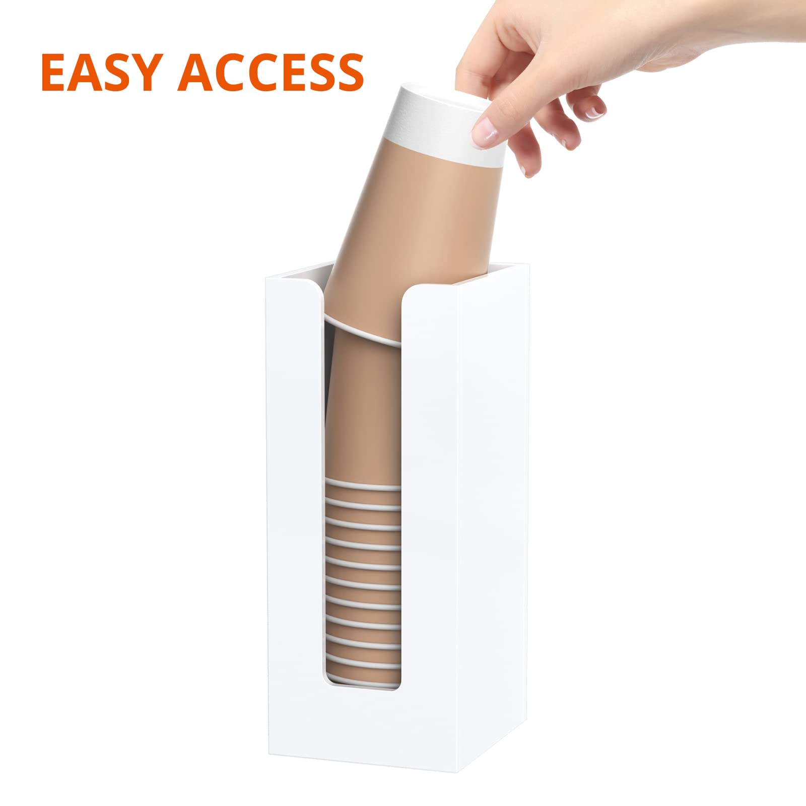 Functional - comes with 2 pre-drilled holes on the back of the acrylic cup dispenser storage organizer, it can be either mounted on wall or placed on countertops of your bathroom, kitchen, office, coffee station.