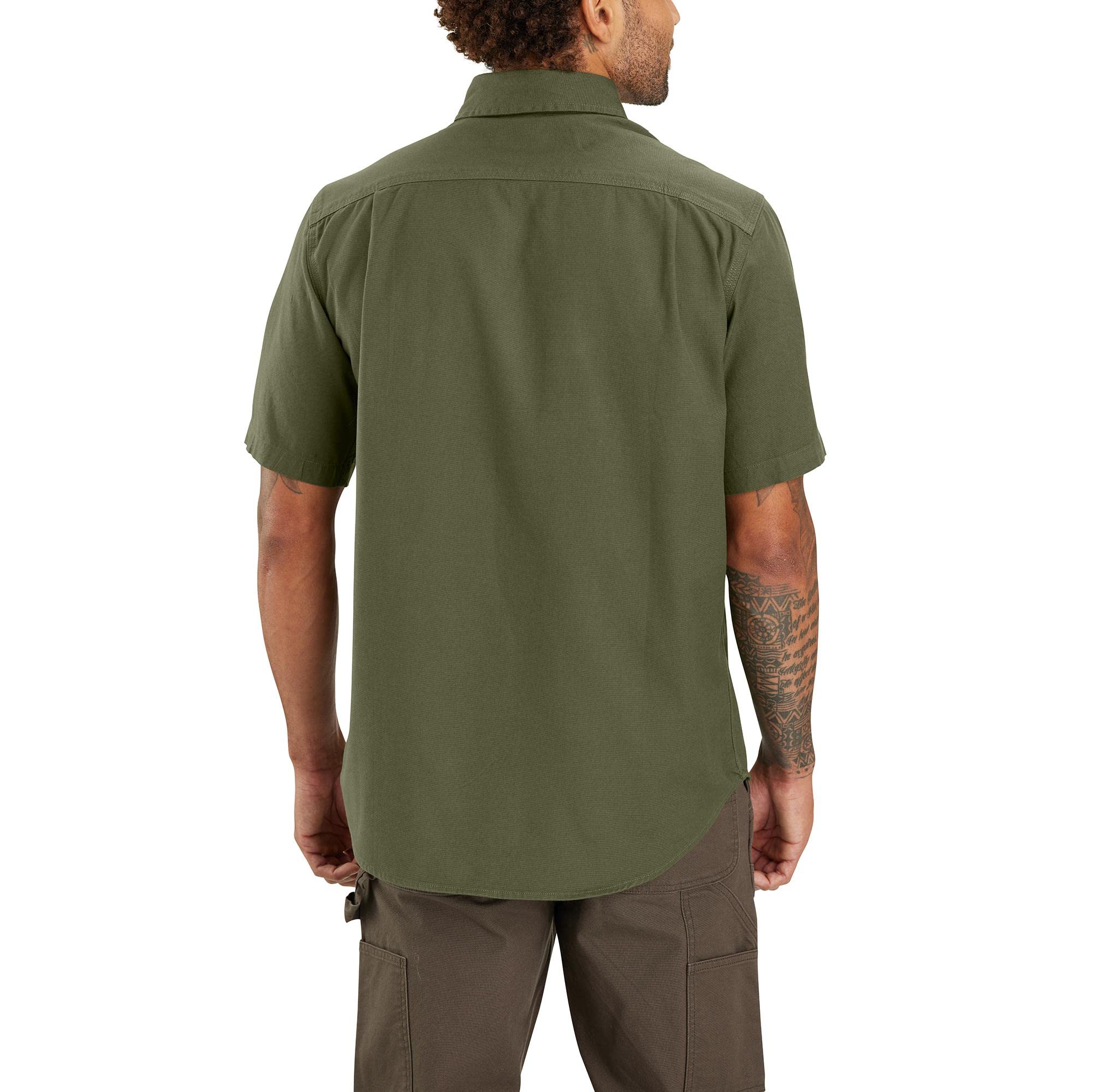 Description This durable short-sleeve work shirt comes standard with built-in stretch, so whatever you're doing, it's easier to do. Relaxed fit 6.5-Ounce, 98% cotton/2% Spandex rugged flex technology for ease of movement two chest pockets with additional left-chest pocket panel for added storage button-down collar two-button adjustable cuffs with extended plackets faux horn buttons drop-tail hem for additional coverage Carhartt-strong triple-stitched main seams imported