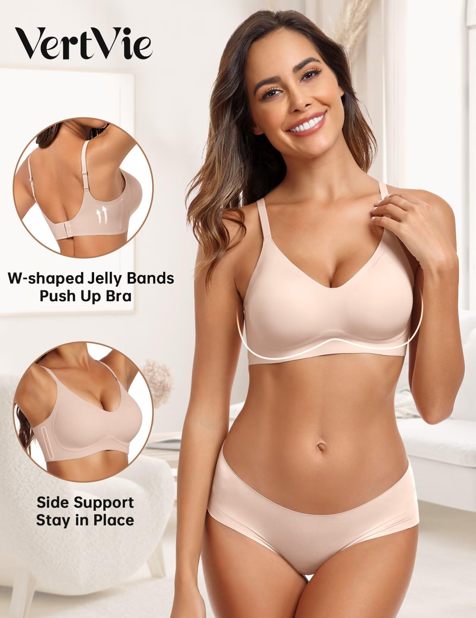 【Jelly Wireless Push Up Bras】 Our womens bras feature a W-shaped 'Jelly Bands' and 3D molded cups for double support. These wireless bras offer full support and a perfect fit for most body shapes, from small to plus size, and cup sizes A to DD. The push-up pad creates a naturally round and full shape for younger women and provides ultimate comfort and support for older women. Designed to boost confidence, our bra helps women look effortlessly elegant
