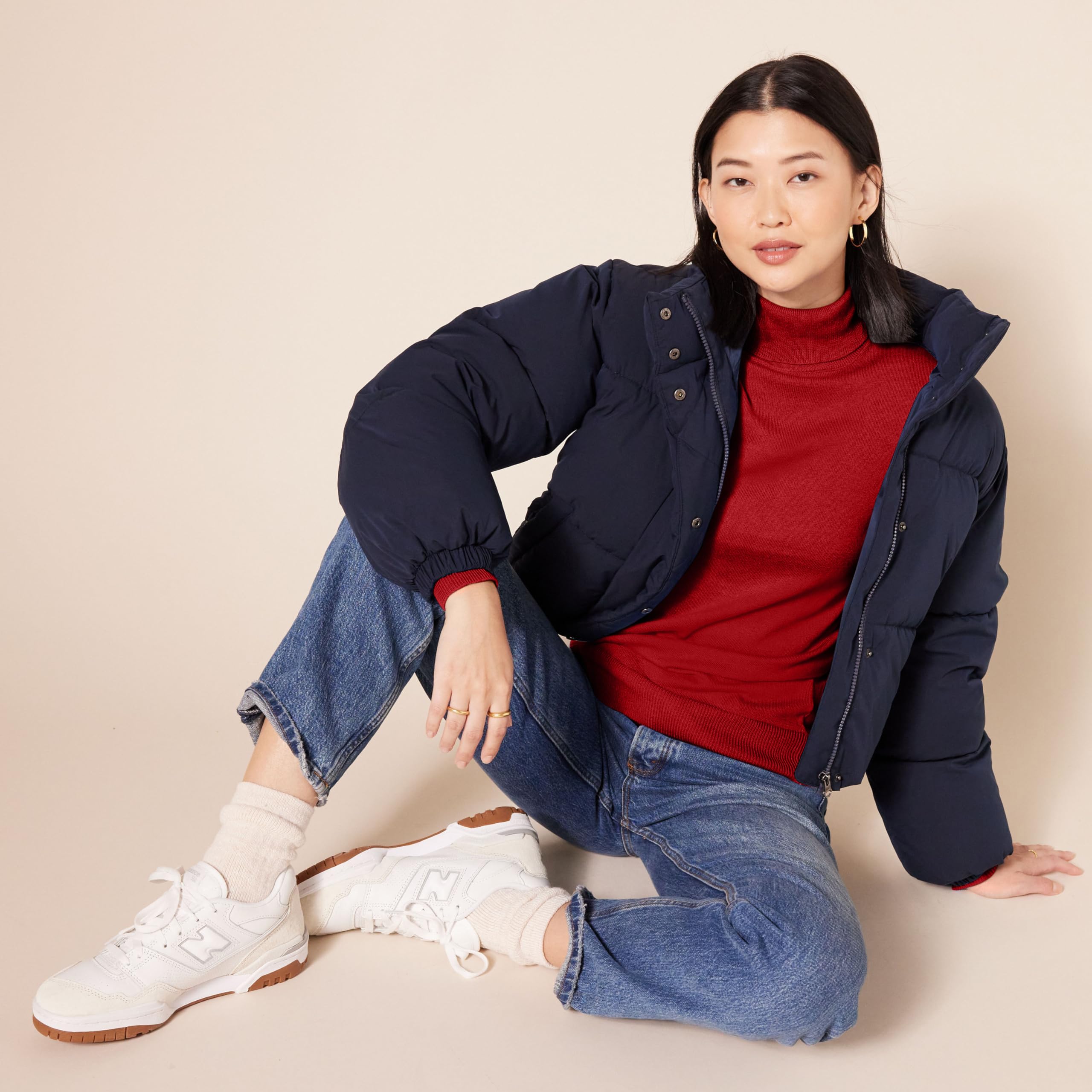 DETAILS: Features a fold-over turtleneck, rib detail at neck, cuffs, and hem.