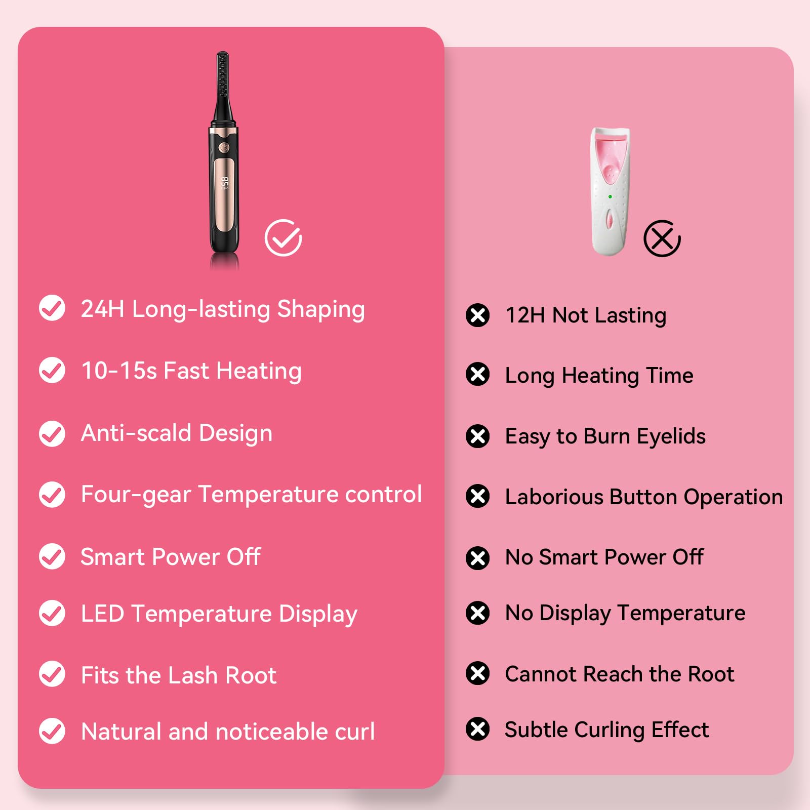SAFE & BEGINNER-FRIENDLY DESIGN - Anti-scald technology protects your eyelids, while the soft silicone pad and spring mechanism prevent pinching. The lash separator tool ensures natural, clump-free curls. Designed for easy, pain-free use, even for beginners! Perfect for all eye shapes and lash types.