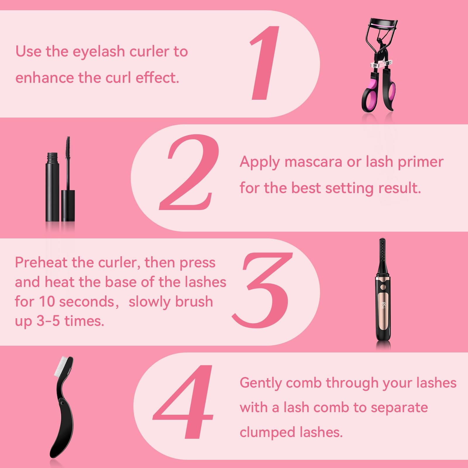 3-IN-1 MULTIFUNCTIONAL DESIGN FOR ALL LASH TYPES - Achieve the perfect curl with our 3-in-1 eyelash curler, heated lash curler, and lash comb. Use the traditional curler for an instant lift, enhance it with the heated curler for long-lasting curls, and finish with the comb for clump-free, well-separated lashes. If you have thick and stiff lashes, you'll need to use the eyelash curler. The heated eyelash curler is mainly for setting the mascara and perfecting the finer details.