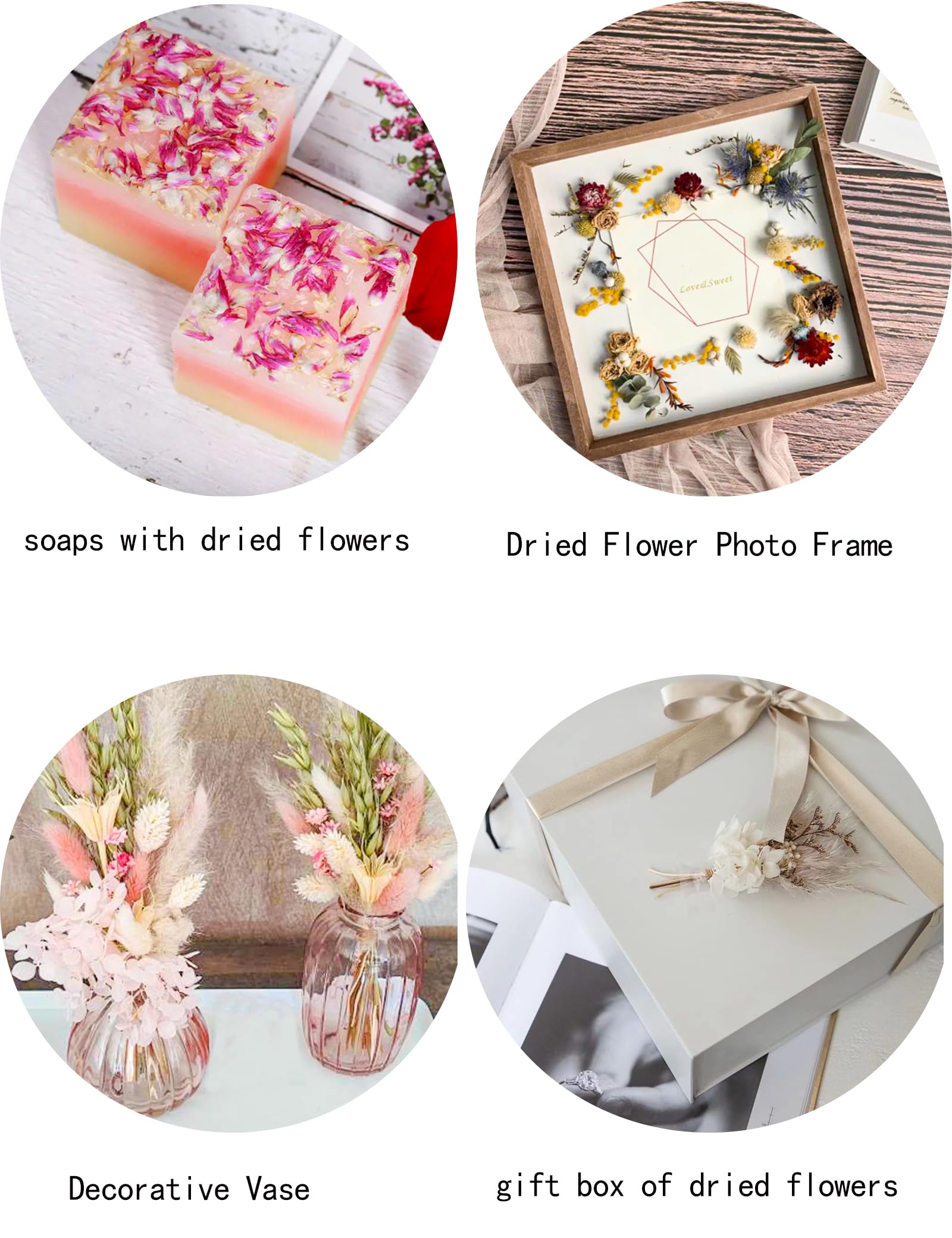 Note: Some of the petals of the dried flowers may fall off during storage and transport, but this will not affect the overall aesthetic effect.