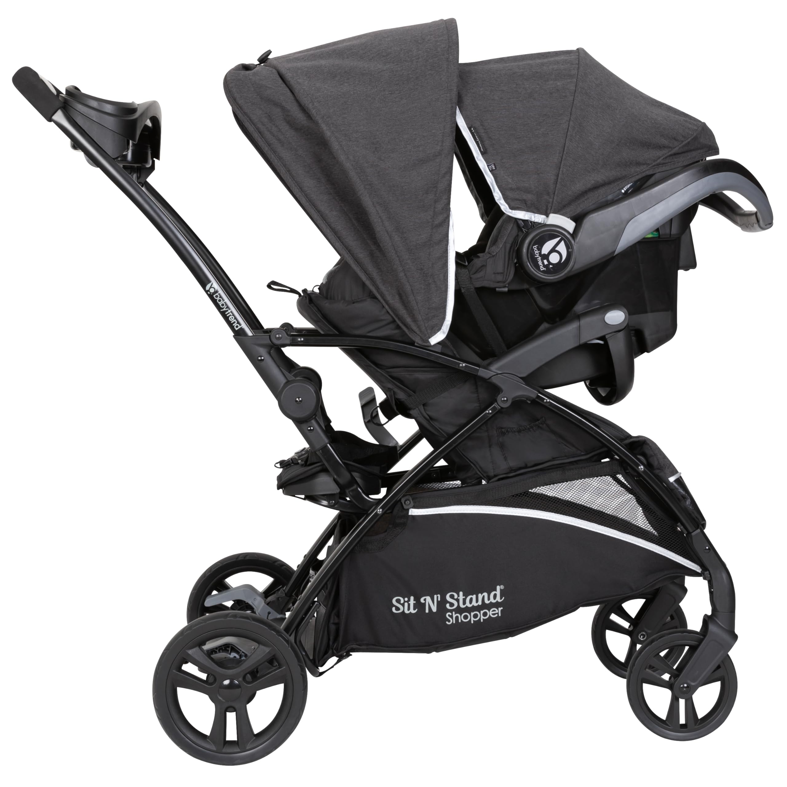 The Baby Trend® Sit N’ Stand® 5-in-1 Shopper Travel System is perfect for your growing family. With the new compact and streamlined frame, our Sit N’ Stand® 5-in-1 Shopper Stroller has 5 modes of use – travel system mode, car seat in the front seat and older child standing on platform, child in the stroller seat only, child in the stroller seat with sibling sitting on bench, and child in the stroller seat with sibling standing. The front and back seats can hold kids up to 50lbs each. The included infant car seat can accommodate weights from 4-35 lbs. Strolling with our Sit N’ Stand® Shopper Travel System will be a breeze for you and your little ones. Your children will appreciate Comfort Cabin, which includes removable extra-long canopy with UPF 50+ protection, multi-position reclining seat, deluxe fabrics and premium padding that will keep them safe and comfy, staying away from the harmful sun rays. Parents will love our Parent Premiums that have a modern parent console with multi-directional cell phone positioner and extra-deep cup holders. Mom and dad now can easily access the large storage basket in the front and back. With the innovative MagneTec™ Basket, parents can open and close the basket very quickly with the help of strong magnets to hold the basket closed. This practical extra-large basket can be extended and hold up to 30lbs of parents’ essentials – groceries, toys, diaper bags, etc.