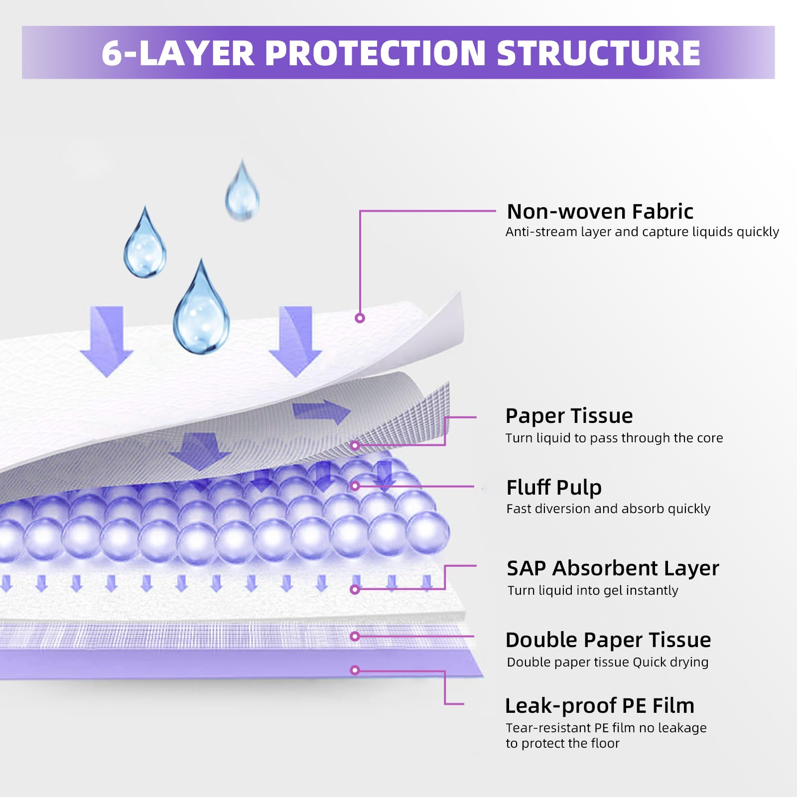 SUPER ABSORBENT: Cat litter pads have a 6-layer thickened design and a super absorbent SAP core to help absorb liquid better. Each pet pee pads for cats can absorb 2-3 days of urine for one cat and can hold up 14 cups of urine