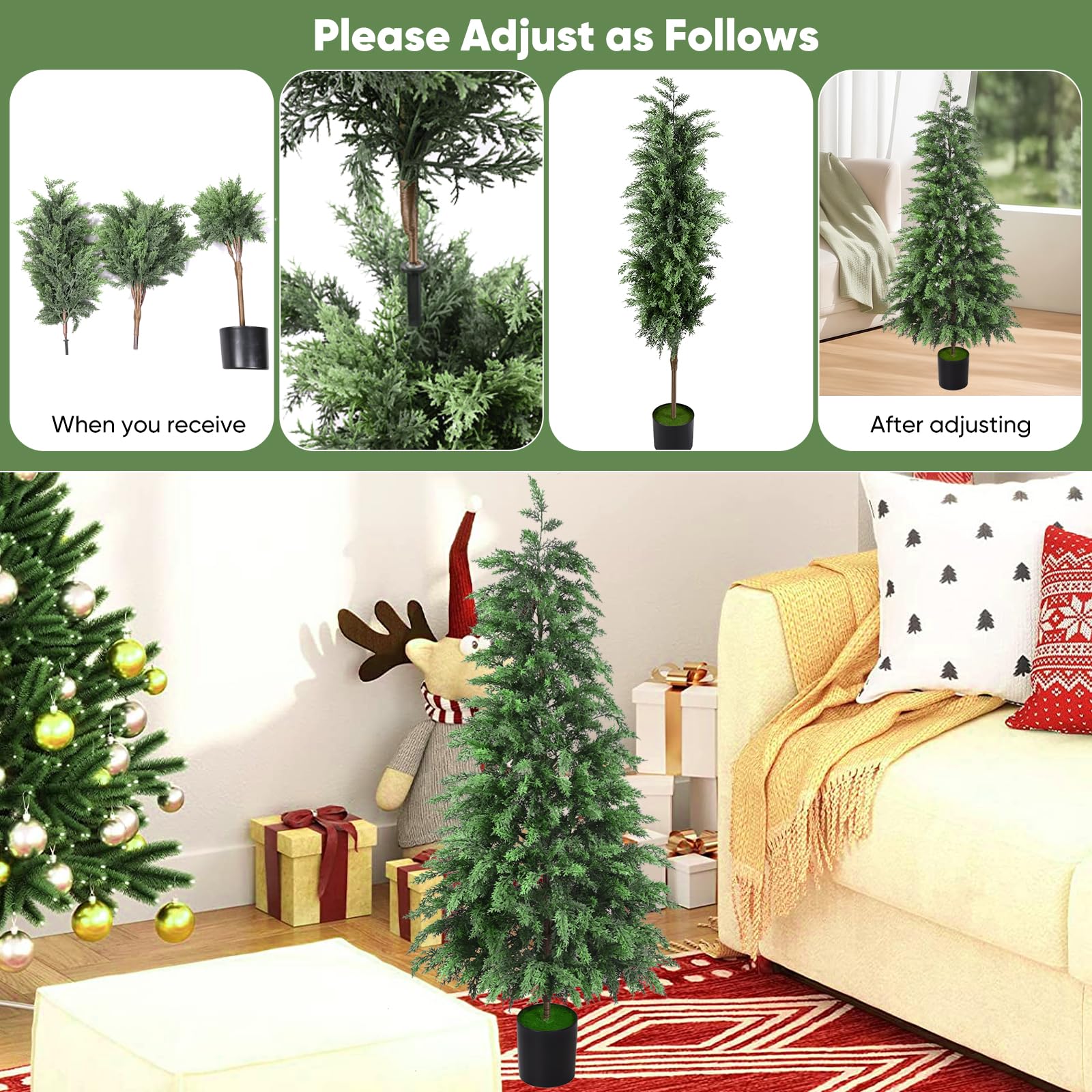 【Highly Realistic with Christmas Ambiance】Crafted with fork cypress leaf design, our artificial tree mimics the natural texture and irregular shape of real cedar while exuding a stronger festive Christmas vibe. The lush green color and lifelike branches create an enchanting holiday atmosphere.