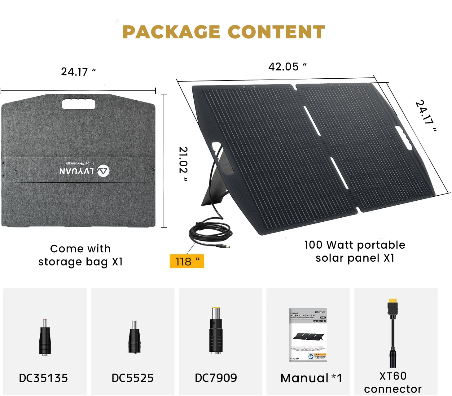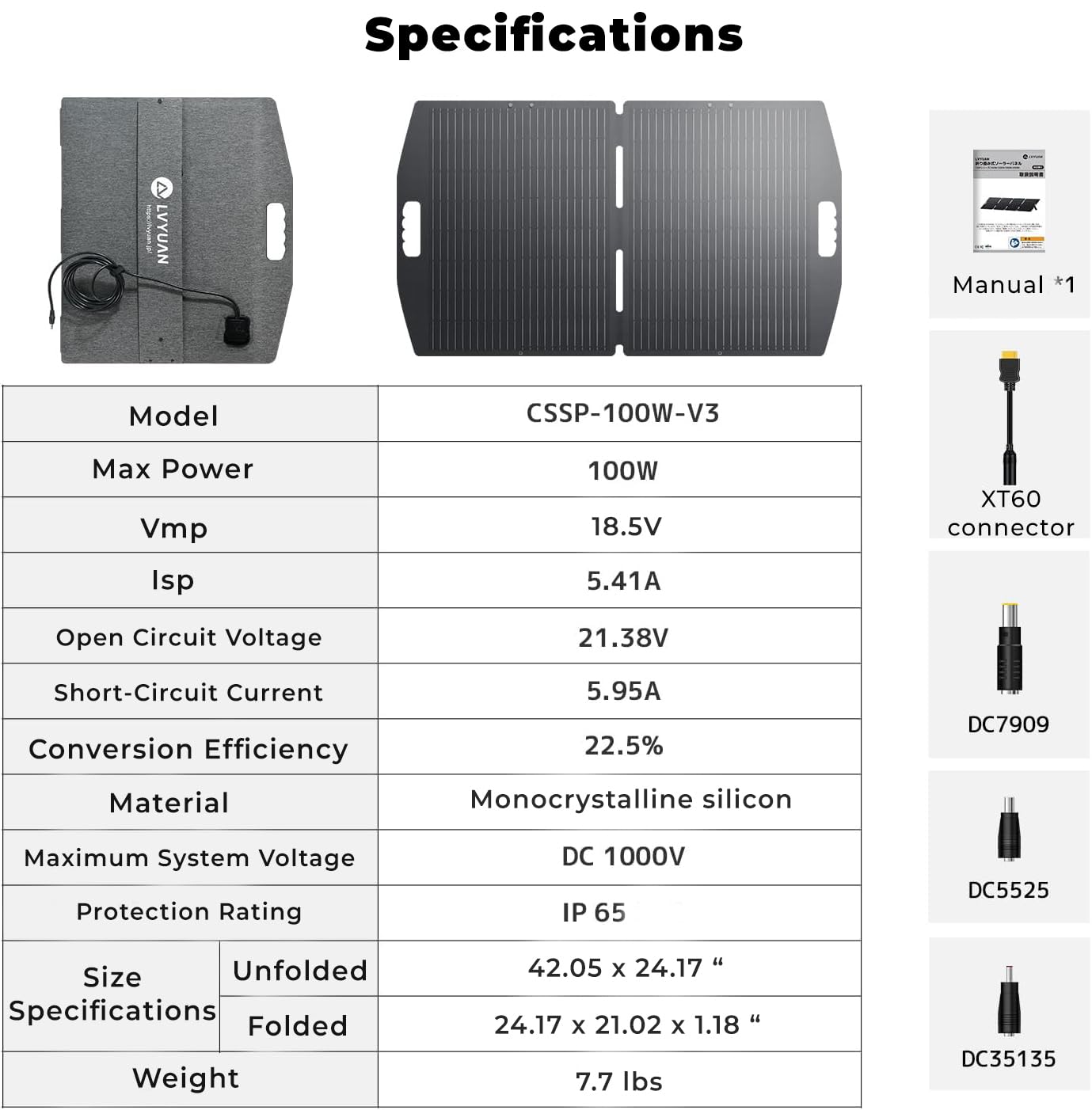[Product Specifications] Model: CSSP-100W-V3 / Rated Output: 100W / Operating Voltage (Vmp): DC 18.50V / Operating Current (Imp): 5.41A / Open Circuit Voltage (Voc): 21.38V / Short Circuit Current (Isc): 5.95A / Conversion Efficiency: Approximately 22.5% / Output Port Standards: DC (XT60/DC5525/DC7909/DC35135) / Cell Type: Monocrystalline (Special ETFE) / Unit Dimensions: 42.05 x 24.17 inches (Stored: 24.17 x 21.02 x 1.18 inches) Weight: 7.7 lbs