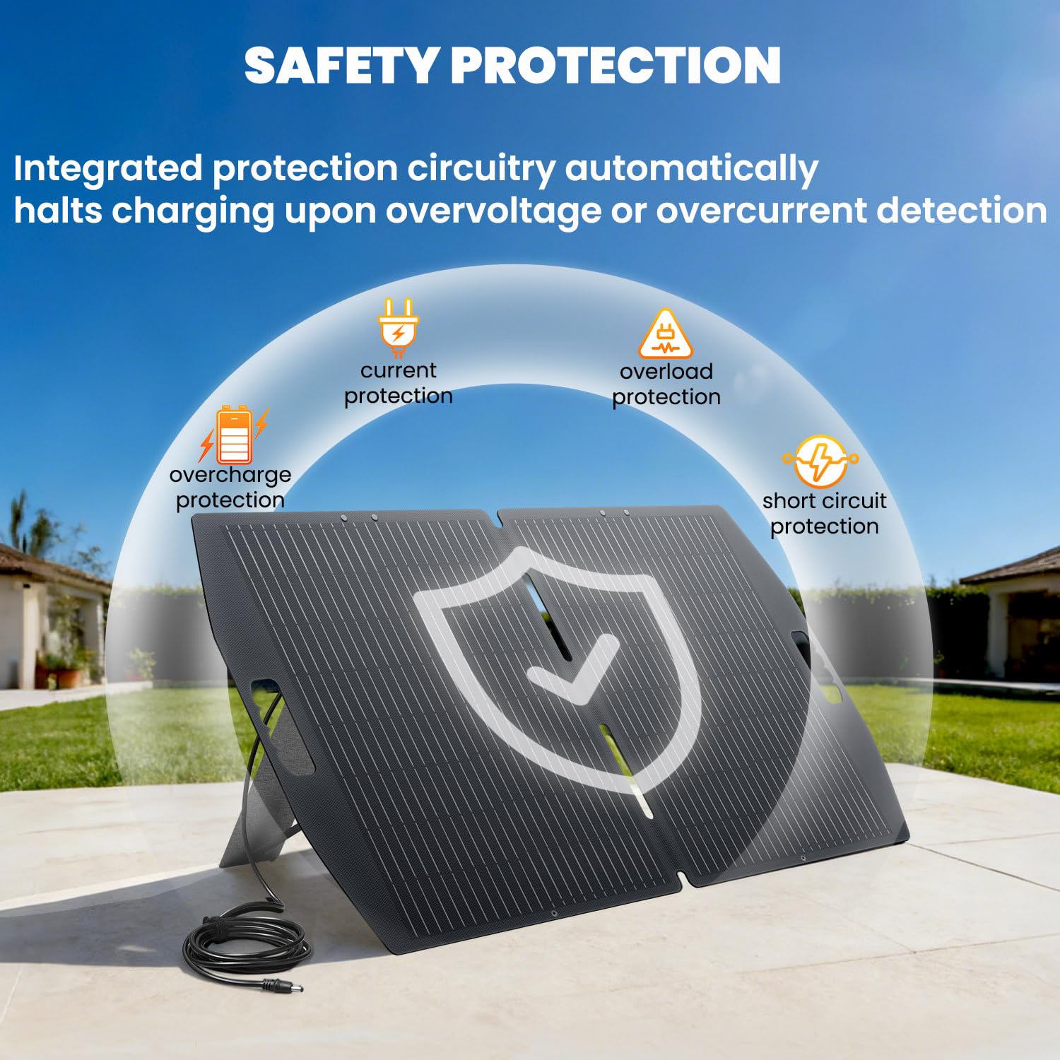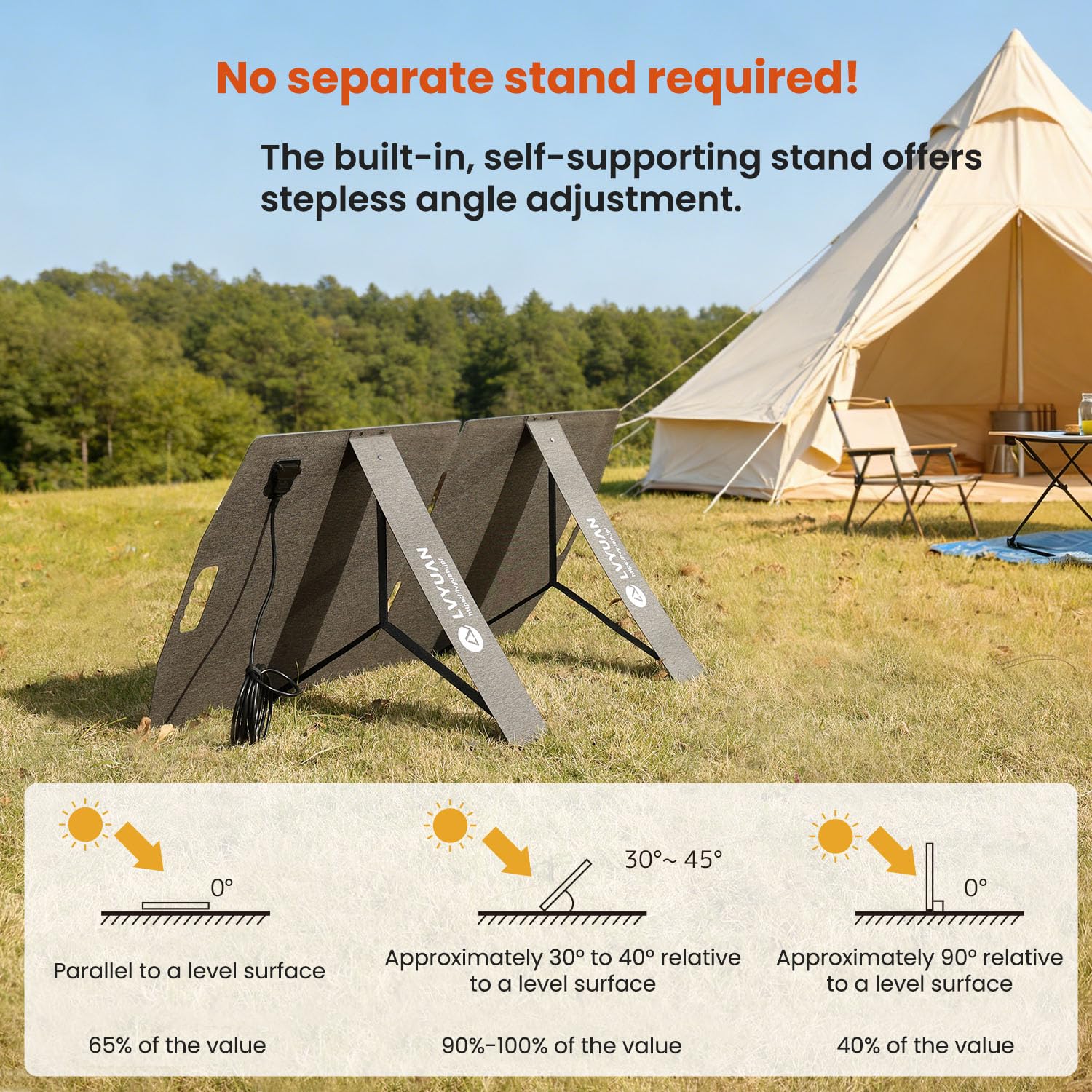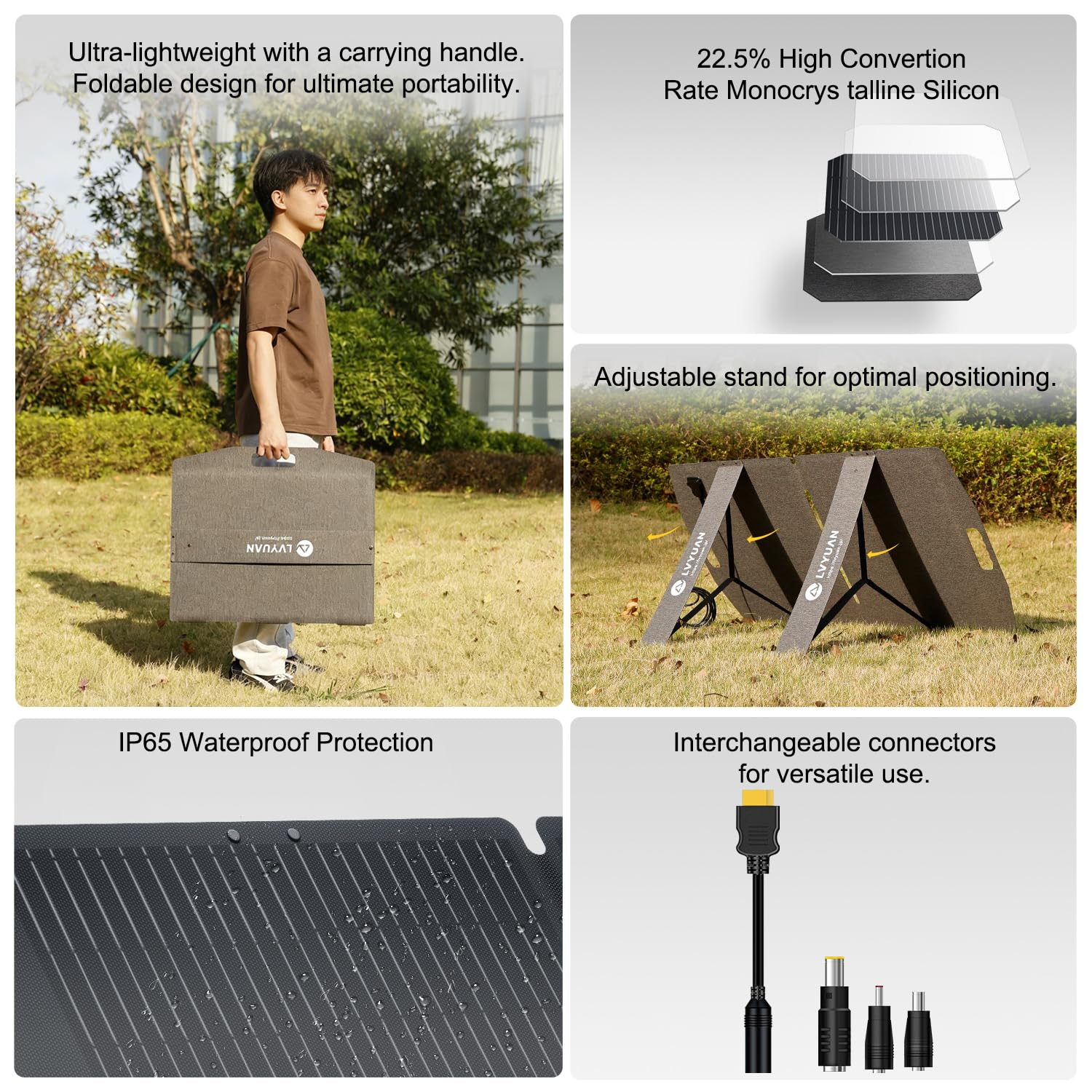 [TÜV Certified & IEC International Standard Product] LVYUAN solar panels meet the international IEC standard and the TÜV certification of th[Tool-free Set Up] Empowering an rapid solar panel deployment by innovative and intutive design. Position the solar charger optimally using suitable items nearby or secure it with included carabiners through the panel's reinforced grommets. The weather-resistant construction permits ground placement without compromising the panel or electrical components. Bundled adapter cables and multiple DC connectors guarantee broad device compatibility.e German technical inspection association. Certified by TÜV Saarland and manufactured to strict standards.