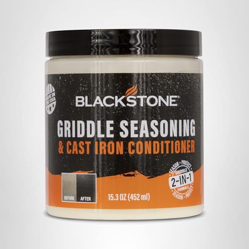 "Reinstate the stick-resistant, easy-release finish on your Blackstone griddle cooktop. The Blackstone seasoning and conditioner is exactly what you need to make sure your griddle and cast iron are well-seasoned and protected. This two-in-one grill seasoning oil offers results you can trust to get your griddle ready for use, or help maintain your current seasoning to prevent sticking and rust. Features: • Non-rancid formula: Won’t stick, flake, or go rancid, unlike other conditioners made with flaxseed oil or animal fats. • Plant-based: Perfect option for vegans and vegetarians. • Food safe: Contains no harsh chemicals. • Wide application: Use Blackstone seasoning oil on griddle surfaces, grill grates, pans, skillets, woks, griddles, dutch ovens and more. • Seasoning + conditioning: Restores the easy-release layer on your griddle and protects it from rust. How to use? 1) Wipe down the cooking surface with a damp towel. 2) Once the cooking surface is nice and clean, fire up the burners and heat your griddle for 10-15 minutes. Scoop Blackstone griddle oil on top and apply to the surface using a pair of tongs and a wad of paper towels. 3) Spread the seasoning evenly across the entire cooking surface evenly – even the edges and sides. 4) Let the seasoning burn (smoke) off 5) Repeat the process 3-5 times (minimum 3 times) 6) You’ll have the perfect surface ready to griddle in no time! To maintain the seasoning, apply a thin layer after each use. About us: Blackstone products are designed and engineered in the USA with the latest technology and innovation, but we are more than just another outdoor cooking appliance company. Our main focus is on our consumers and designing quality products that yield the best results. Our goal is to bring family and friends together with the most efficient and functional griddles on the market. Join the Griddle Nation and cook anything, anytime, anywhere with a Blackstone.".