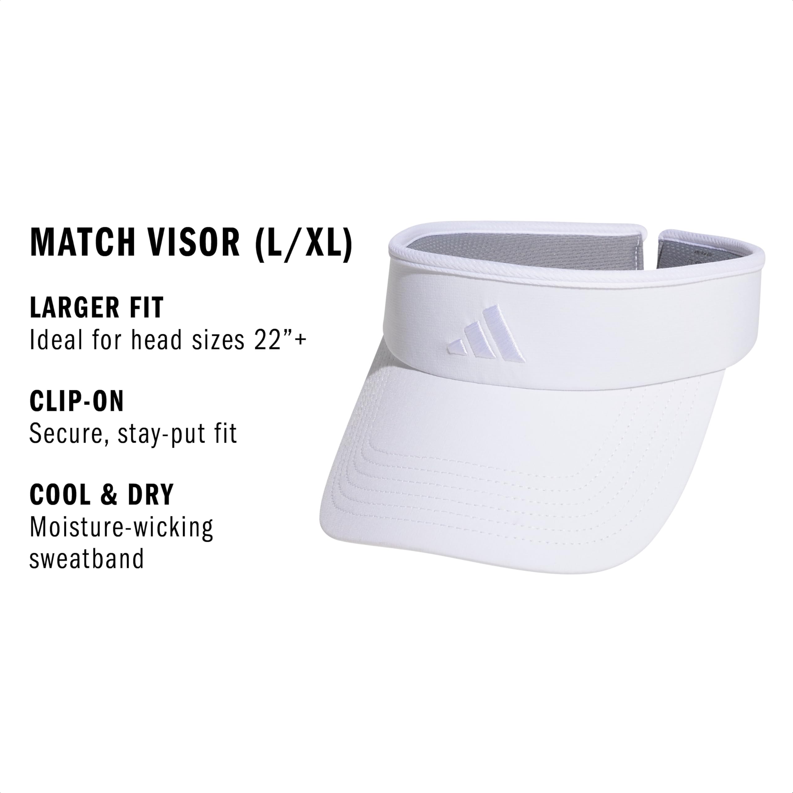 Description Keep glare and hair out of your eyes wearing this women's adidas Match 2 Visor. Its lightweight, one-size-fits-all design provides full brim coverage for the court, the beach or wherever. Sweat-wicking material keeps you dry through game, set and match.