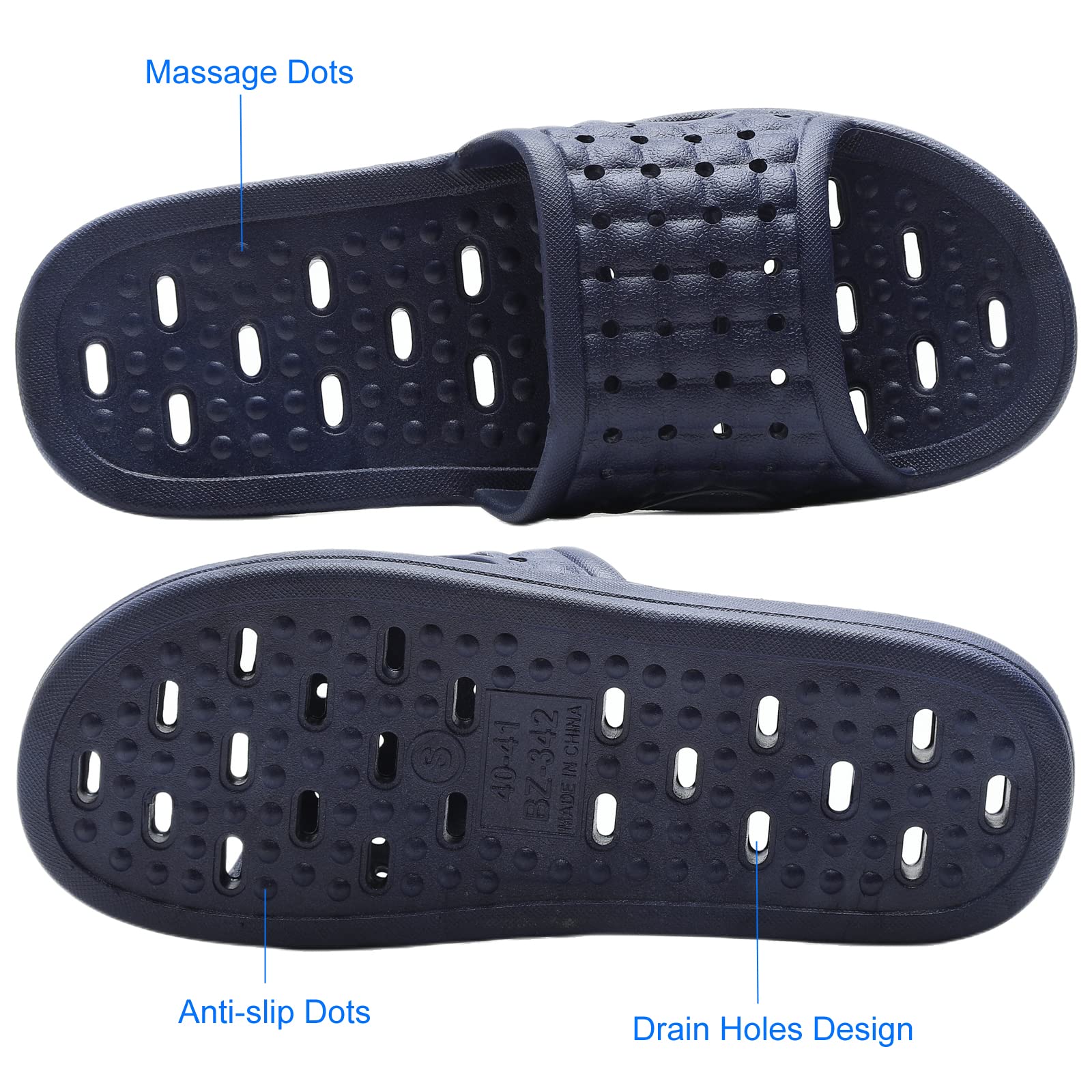 COMFORT & RELAX – The shower slides have soles with a upwarp designed for ergonomic support, relieve the pressure brought by toes when walking, they are comfortable to wear. The upper soles have tiny little bumps that stimulate your feet a little bit which helps to get the blood flowing, help to make your feet feel better and more relaxed.
