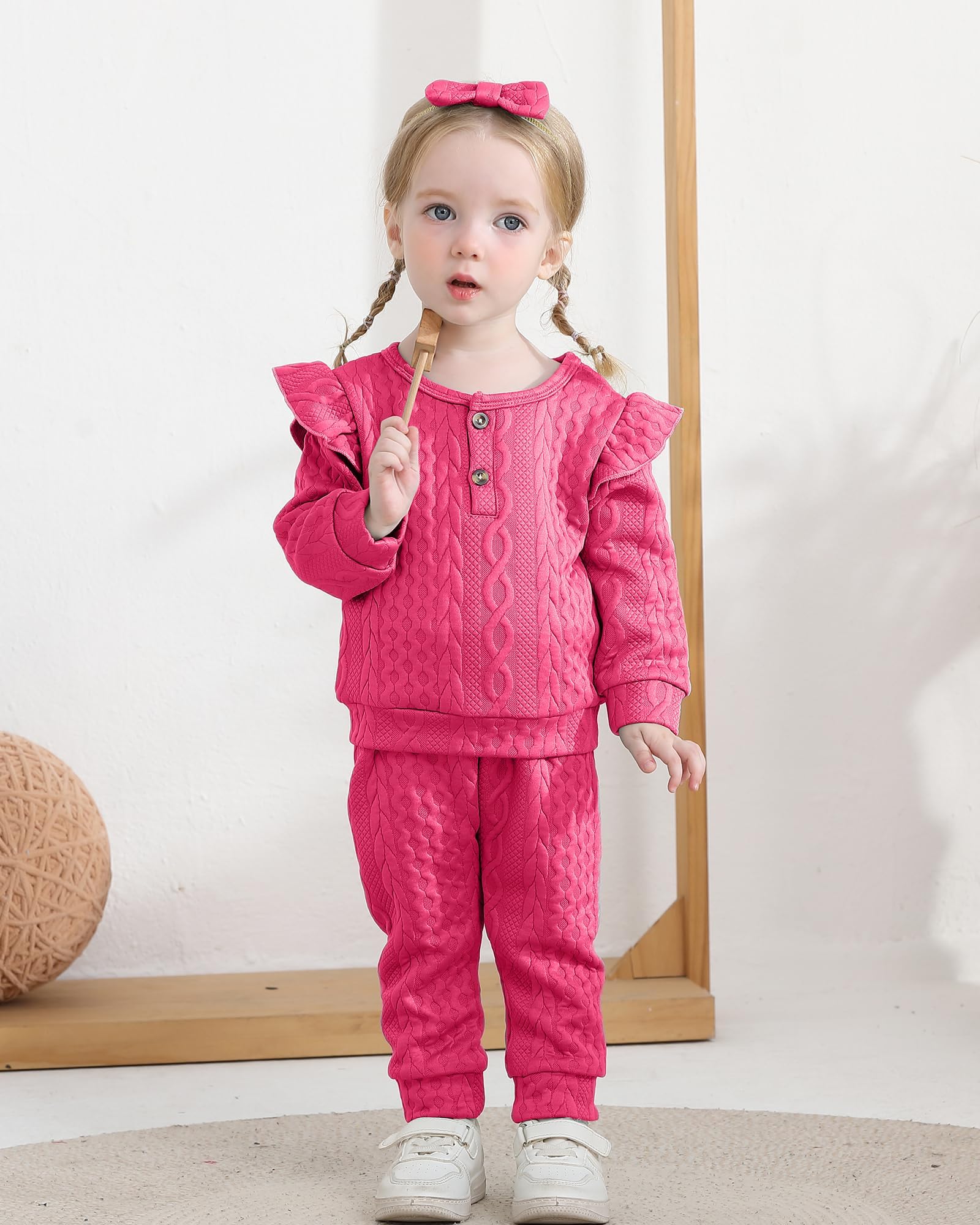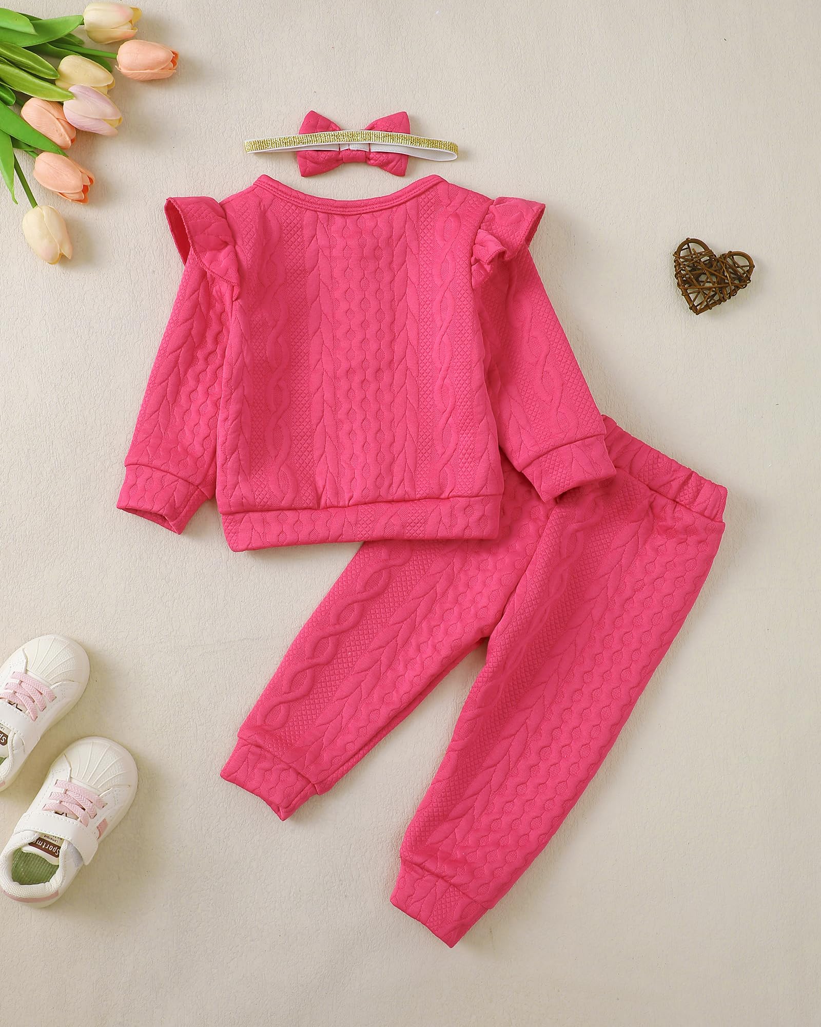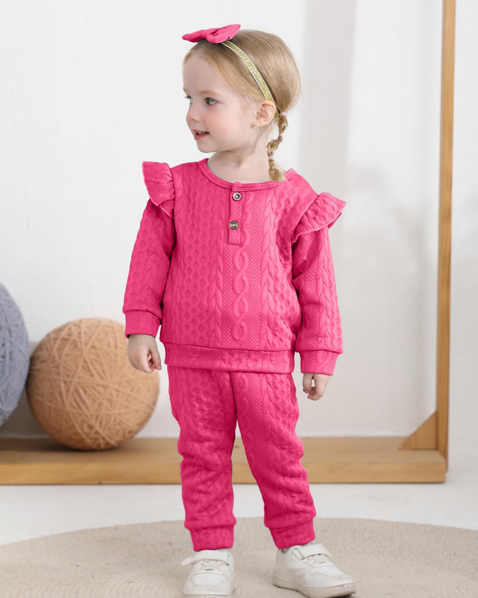 Designs: Baby girl 2 piece pant sets feature the ruffled shoulder, a headband and girls pant with pockets, pullover long sleeve shirts tops, solid color.