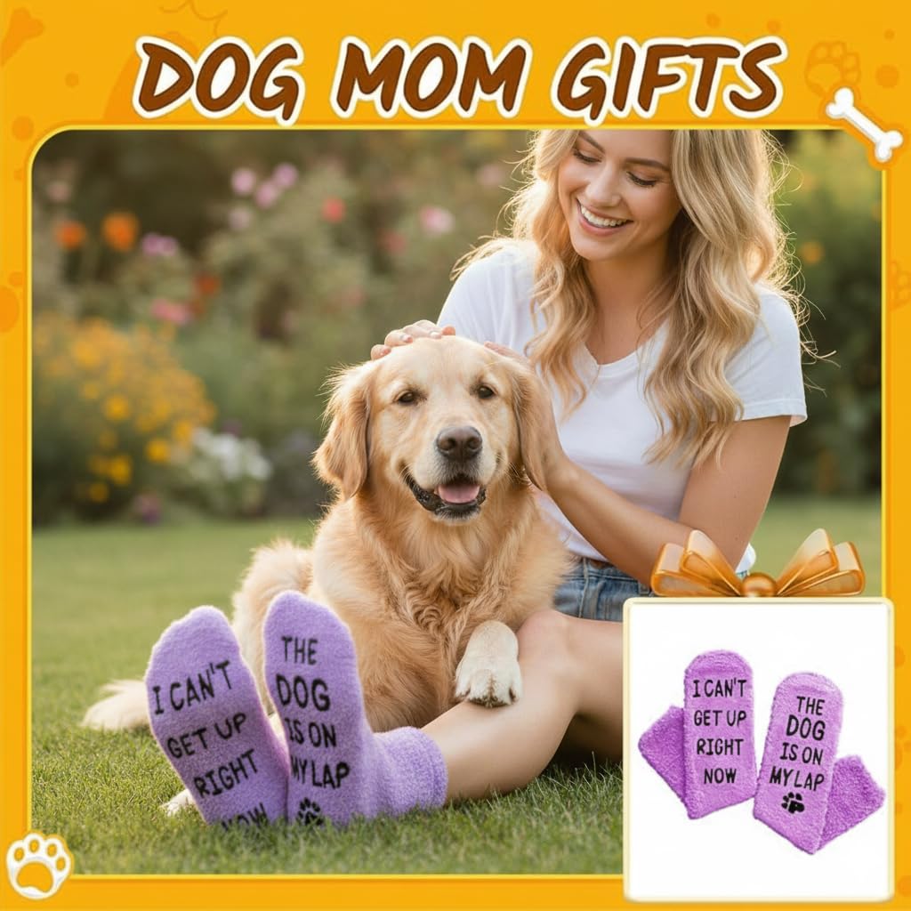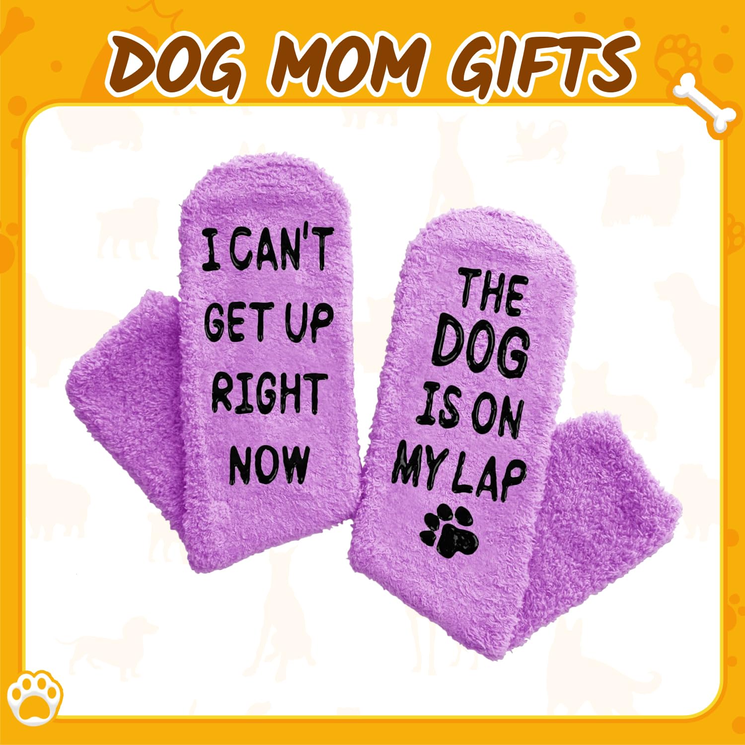 FUZZY DOG MOM SOCKS: These purple fuzzy dog mom socks feature cute dog paws, grippers on the bottom and funny sayings "I CAN'T GET UP RIGHT NOW. THE DOG IS ON MY LAP".