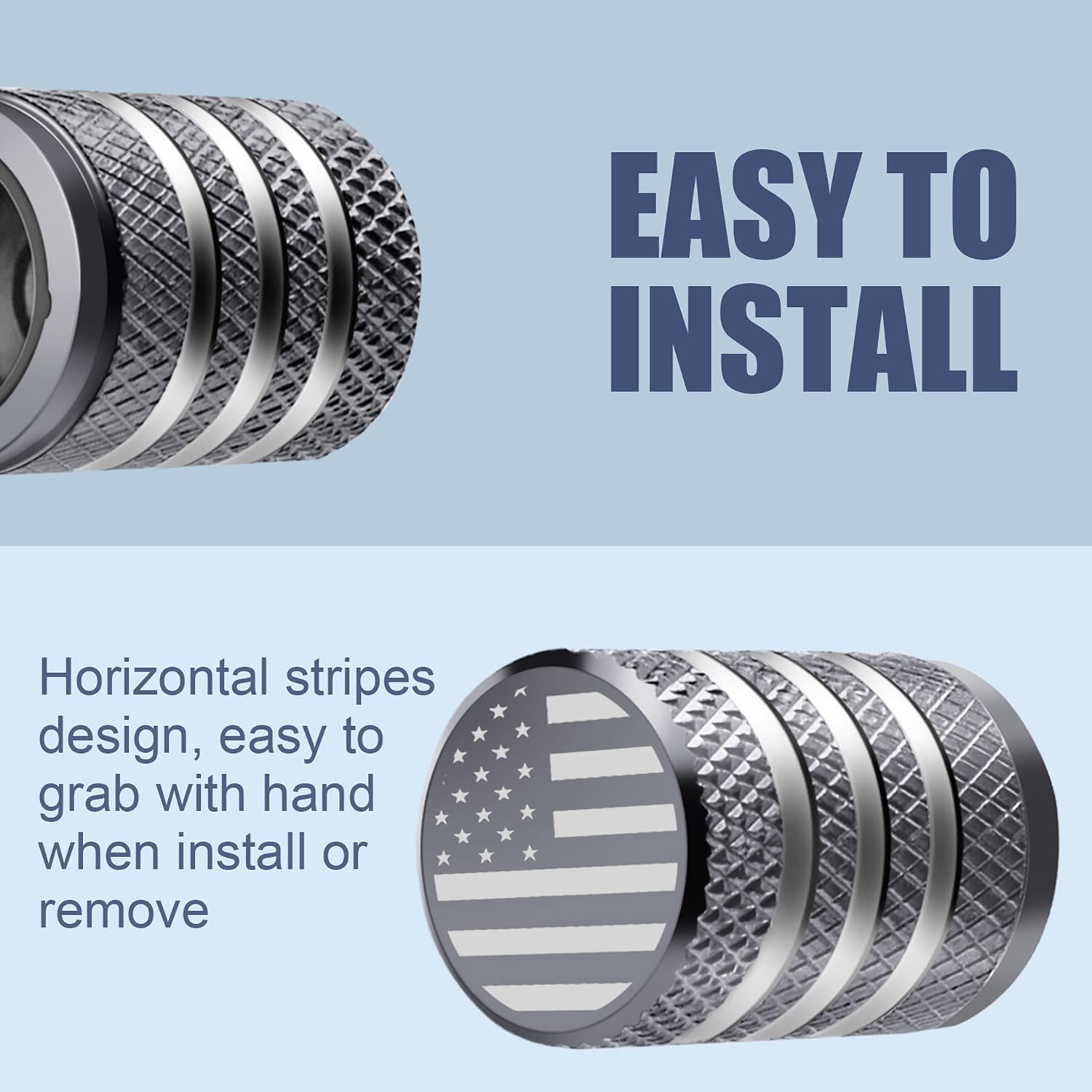 EASY to INSTALL: With the simple and smooth horizontal stripes design, DECURCAR valve stem caps are easily hand tightened or took off.