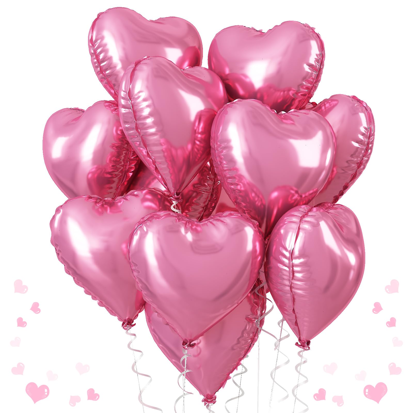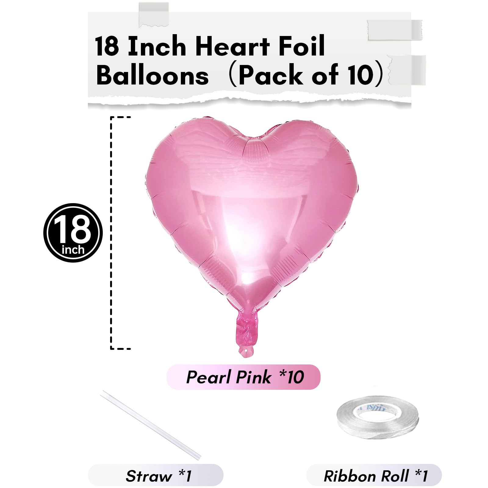 Light Pink Heart Balloons: Set of 10 pastel pink 18-inch heart-shaped foil balloons. Comes with a straw and ribbon for easy inflation and decoration. These charming heart balloons are a perfect choice for any party or celebration